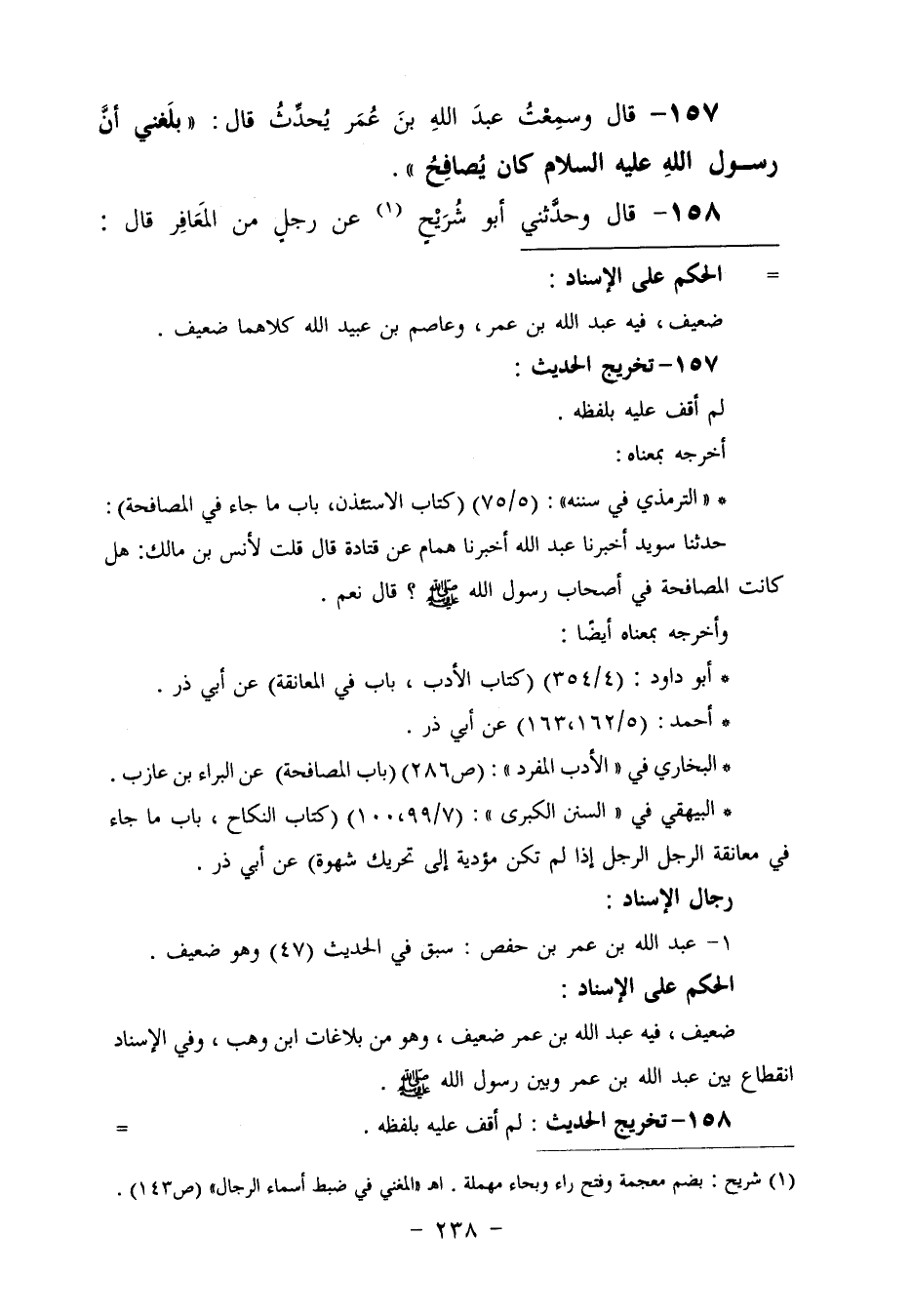 ١٥٧ - وَسَمِعْتُ عَبْدَ اللَّهِ بْنَ عُمَرَ، يُحَدِّثُ قَالَ: بَلَغَنِي " أَنَّ رَسُولَ اللَّهِ عَلَيْهِ السَّلَامُ كَانَ يُصَافِحُ