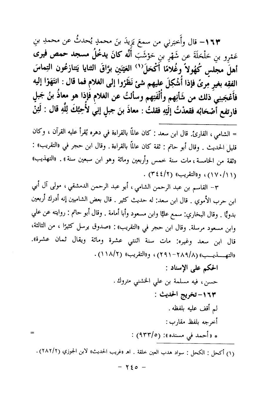 ١٦٣ - وَأَخْبَرَنِي مَنْ، سَمِعَ يَزِيدَ بْنَ مُحَمَّدٍ، يُحَدِّثُ عَنْ مُحَمَّدِ بْنِ عَمْرِو بْنِ حَلْحَلَةَ، عَنْ شَهْرِ بْنِ حَوْشَبٍ، أَنَّهُ كَانَ يَدْخُلُ مَسْجِدَ حِمْصَ فَيَرَى أَهْلَ مَجْلِسٍ كُهُولًا، وَغُلَامًا أَكْحَلَ الْعَيْنَيْنِ، بَرَّاقَ الثَّنَايَا، يَتَنَازَعُونَ الْتِمَاسَ الْفِقْهِ بِغَيْرِ مِرًى، فَإِذَا أَشْكَلَ عَلَيْهِمْ شَيْءٌ نَظَرُوا إِلَى الْغُلَامِ، فَمَا قَالَ: انْتَهَوْا إِلَيْهِ، فَأَعْجَبَنِي ذَلِكَ مِنْ شَأْنِهِمْ وَأَلِفْتُهُمْ، وَسَأَلْتُ عَنِ الْغُلَامِ فَإِذَا هُوَ مُعَاذُ بْنُ جَبَلٍ، فَارْتَفَعَ أَصْحَابُهُ فَقَعَدْتُ إِلَيْهِ، فَقُلْتُ: مُعَاذَ بْنَ جَبَلٍ، إِنِّي لَأُحِبُّكَ لِلَّهِ، قَالَ: لَئِنْ ⦗٢٤٦⦘ كُنْتَ صَادِقًا لَقَدْ سَمِعْتُ رَسُولَ اللَّهِ عَلَيْهِ السَّلَامُ يَقُولُ: «إِنَّ الْمُتَحَابِّينَ فِي اللَّهِ، أَوْ جَلَالِ اللَّهِ عَلَى مَنَابِرَ مِنْ نُورٍ فِي ظِلِّ الْعَرْشِ عَلَى يَمِينِ الرَّحْمَنِ يَوْمَ الْقِيَامَةِ» ⦗٢٤٨⦘