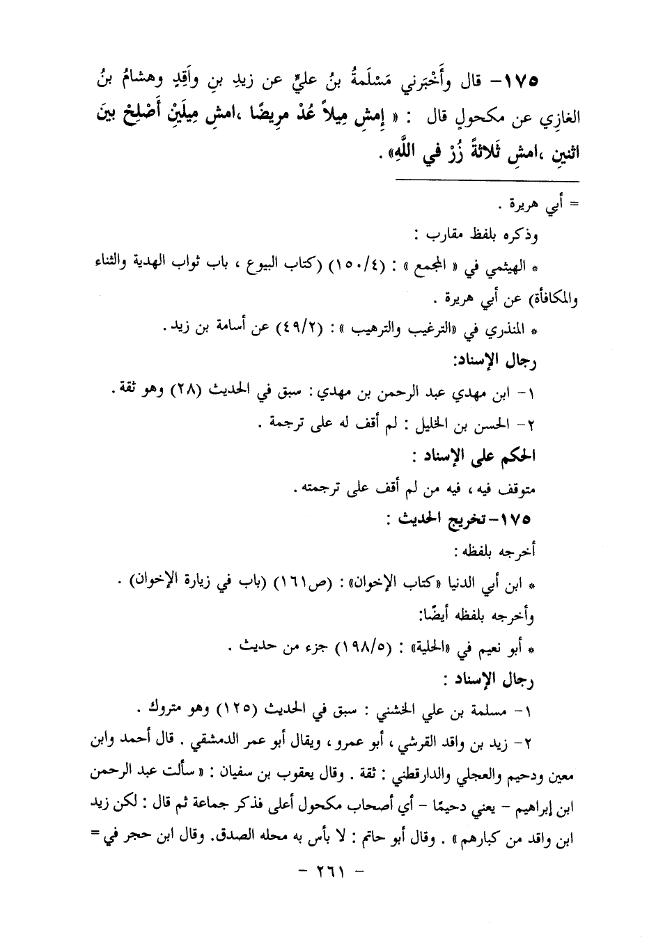 ١٧٥ - وَأَخْبَرَنِي مَسْلَمَةُ بْنُ عُلَيٍّ، عَنْ زَيْدِ بْنِ وَاقِدٍ، وَهِشَامِ بْنِ الْغَازِي، عَنْ مَكْحُولٍ، قَالَ: «امْشِ مِيلًا عُدْ مَرِيضًا، امْشِ مِيلَيْنِ أَصْلِحْ بَيْنَ اثْنَيْنِ، امْشِ ثَلَاثَةً زُرْ فِي اللَّهِ» ⦗٢٦٢⦘