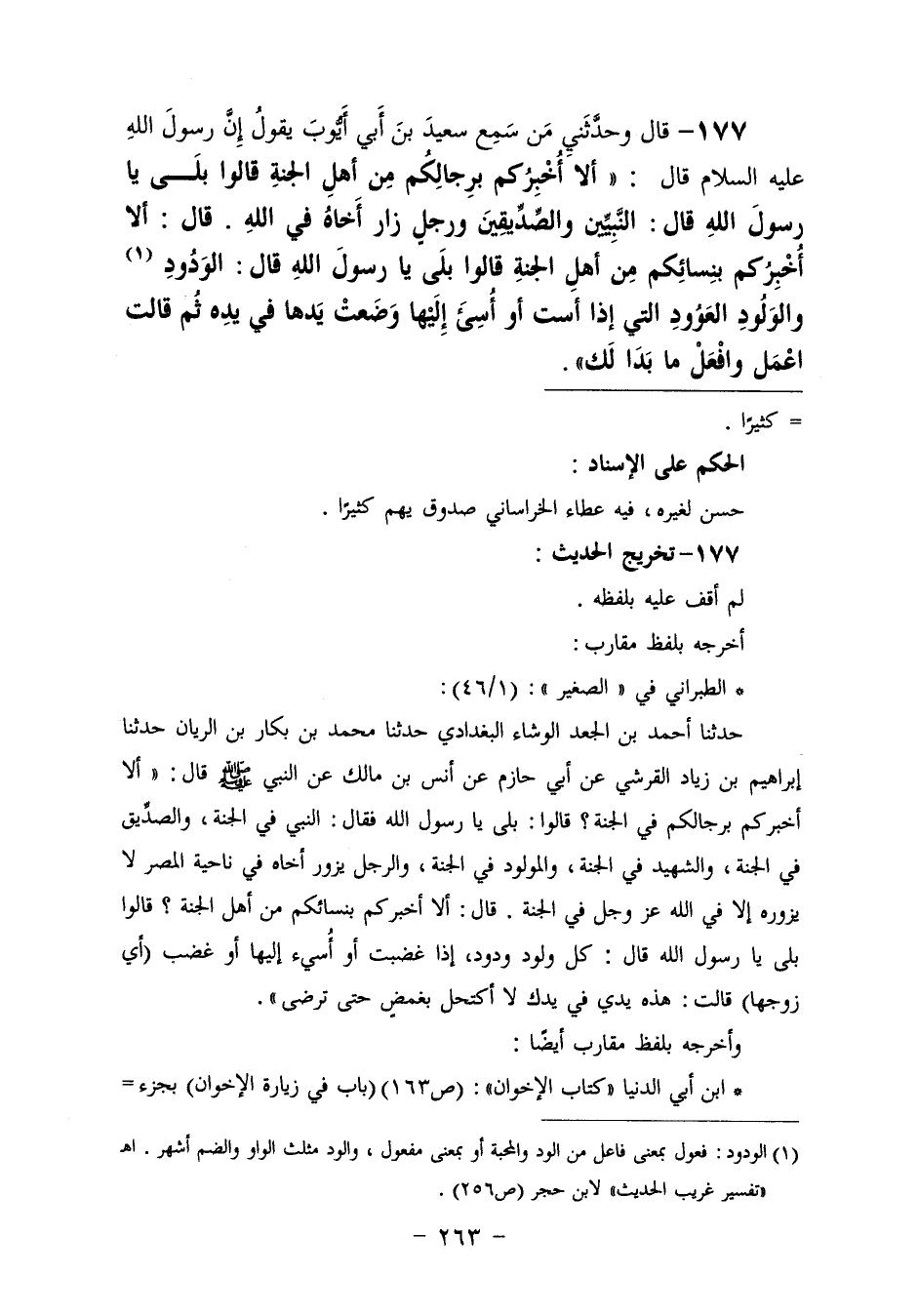١٧٧ - وَحَدَّثَنِي مَنْ، سَمِعَ سَعِيدَ بْنَ أَبِي أَيُّوبَ، يَقُولُ: إِنَّ رَسُولَ اللَّهِ عَلَيْهِ السَّلَامُ قَالَ: «أَلَا أُخْبِرُكُمْ بِرِجَالِكُمْ مِنْ أَهْلِ الْجَنَّةِ؟» ، قَالُوا: بَلَى يَا رَسُولَ اللَّهِ قَالَ: «النَّبِيِّينَ، وَالصِّدِّيقِينَ، وَرَجُلٍ زَارَ أَخَاهُ فِي اللَّهِ» . قَالَ: «أَلَا أُخْبِرُكُمْ بِنِسَائِكُمْ مِنْ أَهْلِ الْجَنَّةِ؟» ، قَالُوا: بَلَى يَا رَسُولَ اللَّهِ قَالَ: " الْوَدُودُ، وَالْوَلُودُ، الْعَؤُودُ الَّتِي إِذَا أَسَاءَتْ أَوْ أُسِيءَ إِلَيْهَا وَضَعَتْ يَدَهَا فِي يَدِهِ، ثُمَّ قَالَتِ: اعْمَلْ وَافْعَلْ مَا بَدَا لَكَ "