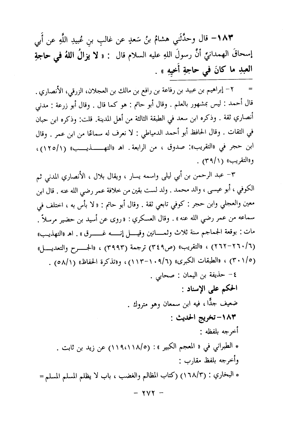 ١٨٣ - وَحَدَّثَنِي هِشَامُ بْنُ سَعْدٍ، عَنْ غَالِبِ بْنِ عُبَيْدِ اللَّهِ، عَنْ أَبِي إِسْحَاقَ الْهَمْدَانِيِّ، أَنَّ رَسُولَ اللَّهِ عَلَيْهِ السَّلَامُ قَالَ: «لَا يَزَالُ اللَّهُ فِي حَاجَةِ الْعَبْدِ مَا كَانَ فِي حَاجَةِ أَخِيهِ»