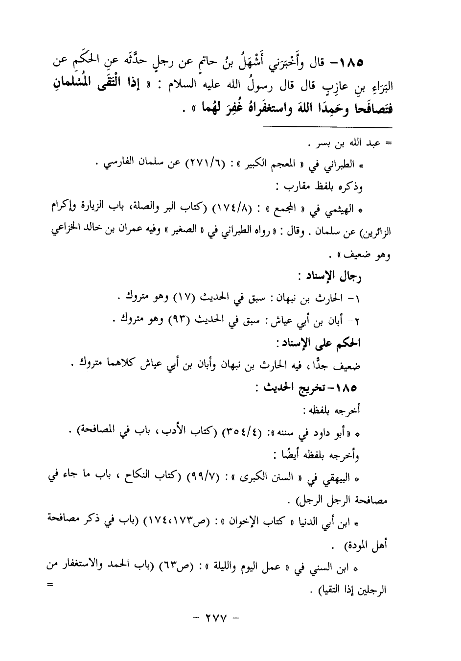 ١٨٥ - وَأَخْبَرَنِي أَشْهَلُ بْنُ حَاتِمٍ، عَنْ رَجُلٍ، حَدَّثَهُ عَنِ الْحَكَمِ، عَنِ الْبَرَاءِ بْنِ عَازِبٍ، قَالَ: قَالَ رَسُولُ اللَّهِ عَلَيْهِ السَّلَامُ: «إِذَا الْتَقَى الْمُسْلِمَانِ فَتَصَافَحَا وَحَمِدَا اللَّهَ وَاسْتَغْفَرَاهُ غُفِرَ لَهُمَا»