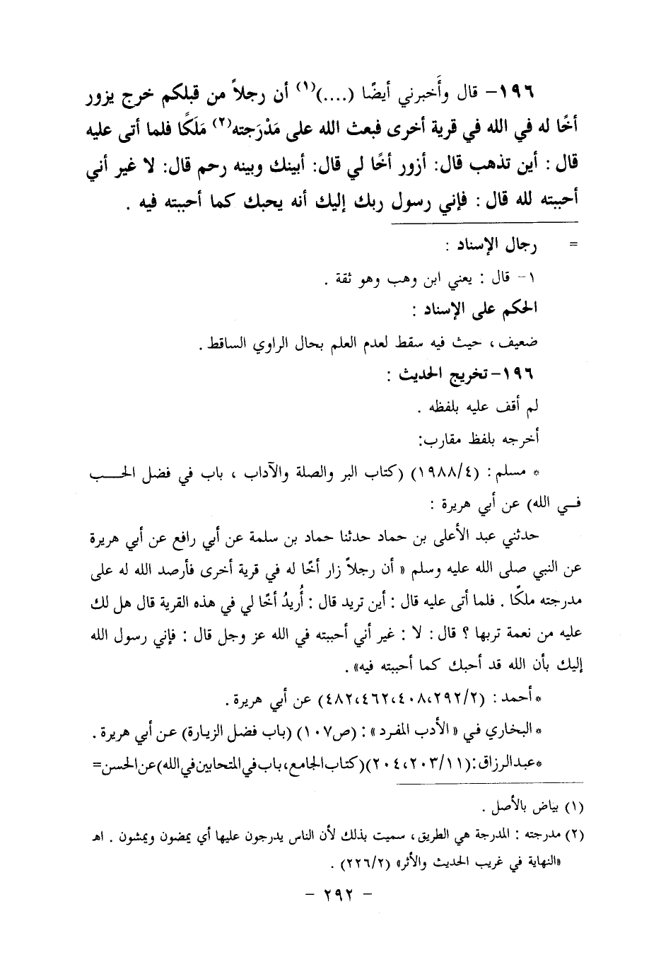 ١٩٦ - وَأَخْبَرَنِي أَيْضًا. . . " أَنَّ رَجُلًا مِنْ قَبْلِكُمْ خَرَجَ يَزُورُ أَخًا لَهُ فِي اللَّهِ فِي قَرْيَةٍ أُخْرَى فَبَعَثَ اللَّهُ عَلَى مَدْرَجَتِهِ مَلَكًا، فَلَمَّا أَتَى عَلَيْهِ قَالَ: أَيْنَ تَذْهَبُ؟ قَالَ: أَزُورُ أَخًا لِي، قَالَ: أَبَيْنَكَ وَبَيْنَهُ رَحِمٌ؟ قَالَ: لَا، غَيْرَ أَنِّي أَحْبَبْتُهُ لِلَّهِ. قَالَ: فَإِنِّي رَسُولُ رَبِّكِ إِلَيْكَ أَنَّهُ يُحِبُّكَ كَمَا أَحْبَبْتَهُ فِيهِ " ⦗٢٩٣⦘،