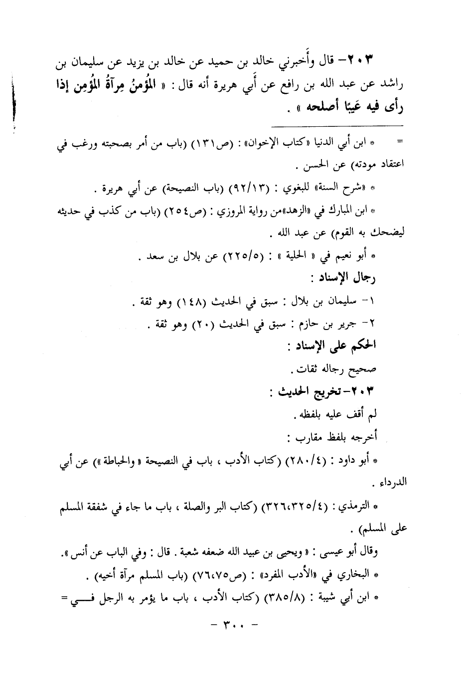 ٢٠٣ - وَأَخْبَرَنِي خَالِدُ بْنُ حُمَيْدٍ، عَنْ خَالِدِ بْنِ يَزِيدَ، عَنْ سُلَيْمَانَ بْنِ رَاشِدٍ، عَنْ عَبْدِ اللَّهِ بْنِ رَافِعٍ، عَنْ أَبِي هُرَيْرَةَ، أَنَّهُ قَالَ: «الْمُؤْمِنُ مِرْآةُ الْمُؤْمِنِ، إِذَا رَأَى فِيهِ عَيْبًا أَصْلَحَهُ»