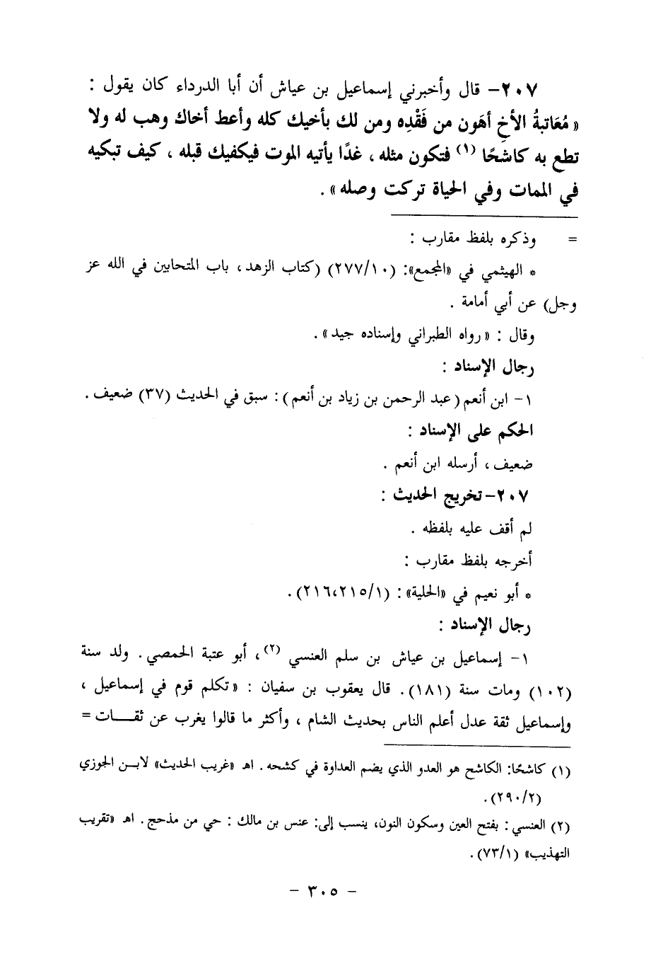 ٢٠٧ - وَأَخْبَرَنِي إِسْمَاعِيلُ بْنُ عَيَّاشٍ، أَنَّ أَبَا الدَّرْدَاءِ، كَانَ يَقُولُ: «مُعَاتَبَةُ الْأَخِ أَهْوَنُ مِنْ فَقْدِهِ، وَمَنْ لَكَ بِأَخِيكَ كُلِّهِ، وَأَعْطِ أَخَاكَ وَهَبْ لَهُ، وَلَا تُطِعْ بِهِ كَاشِحًا فَتَكُونَ مِثْلَهُ، غَدًا يَأْتِيهِ الْمَوْتُ فَيَكْفِيكَ قَبْلَهُ، كَيْفَ تَبْكِيهِ فِي الْمَمَاتِ وَفِي الْحَيَاةِ تَرَكْتَ وَصْلَهُ؟»