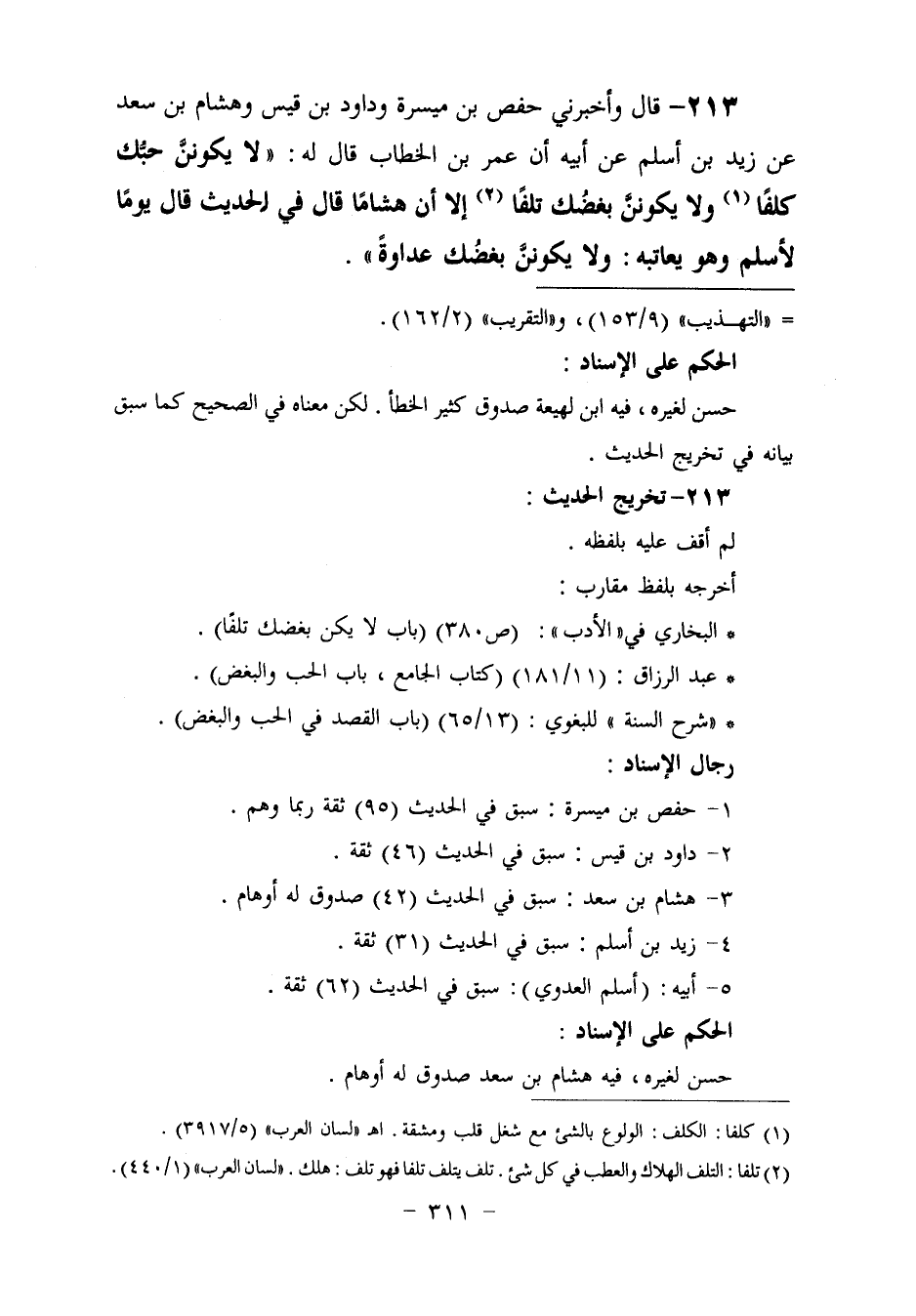 ٢١٣ - وَأَخْبَرَنِي حَفْصُ بْنُ مَيْسَرَةَ، وَدَاوُدُ بْنُ قَيْسٍ، وَهِشَامُ بْنُ سَعْدٍ، عَنْ زَيْدِ بْنِ أَسْلَمَ، عَنْ أَبِيهِ، أَنَّ عُمَرَ بْنَ الْخَطَّابِ، قَالَ لَهُ: «لَا يَكُونَنَّ حُبُّكَ كَلَفًا وَلَا يَكُونَنَّ بُغْضُكَ تَلَفًا» إِلَّا أَنَّ هِشَامًا قَالَ فِي الْحَدِيثِ: قَالَ يَوْمًا لَأَسْلَمَ وَهُوَ يُعَاتِبَهُ: وَلَا يَكُونَنَّ بُغْضُكَ عَدَاوَةً
