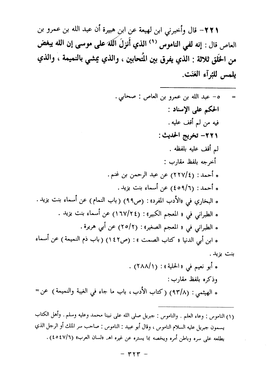 ٢٢١ - وَأَخْبَرَنِي ابْنُ لَهِيعَةَ، عَنِ ابْنِ هُبَيْرَةَ، أَنَّ عَبْدَ اللَّهِ بْنَ عَمْرِو بْنِ الْعَاصِ، قَالَ: " إِنَّهُ لَفِي النَّامُوسِ الَّذِي أَنْزَلَ اللَّهُ عَلَى مُوسَى أَنَّ اللَّهَ يُبْغِضُ مِنَ الْخَلْقِ ثَلَاثَةً: الَّذِي يُفَرِّقُ بَيْنَ الْمُتَحَابِّينِ، وَالَّذِي يَمْشِي بِالنَّمِيمَةِ، وَالَّذِي يَلْمِسُ لِلْبُرَآءِ الْعَنَتَ "