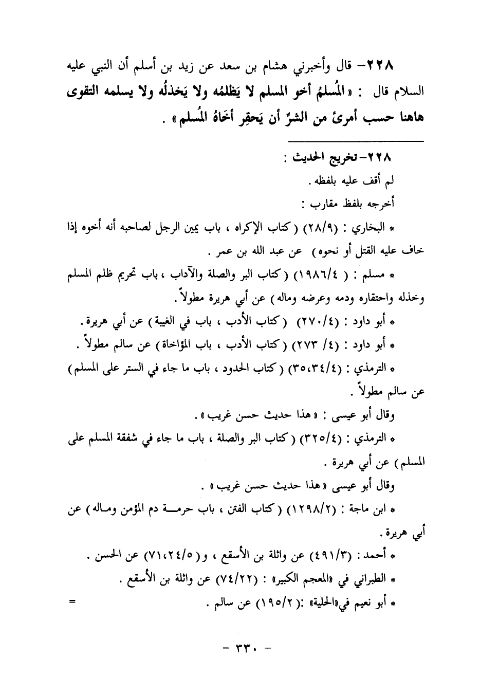 ٢٢٨ - وَأَخْبَرَنِي هِشَامُ بْنُ سَعْدٍ، عَنْ زَيْدِ بْنِ أَسْلَمَ، أَنَّ النَّبِيَّ عَلَيْهِ السَّلَامُ قَالَ: «الْمُسْلِمُ أَخُو الْمُسْلِمِ، لَا يَظْلِمُهُ وَلَا يَخْذُلُهُ، وَلَا يُسْلِمُهُ، التَّقْوَى هَاهُنَا، حَسْبُ امْرِيءٍ مِنَ الشَّرِّ أَنْ يَحْقِرَ أَخَاهُ الْمُسْلِمَ»