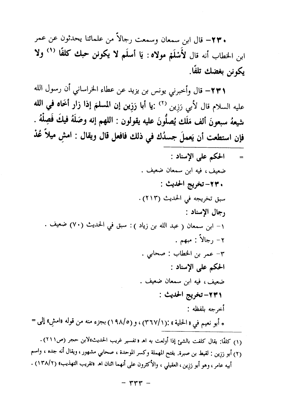 ٢٣٠ - قَالَ ابْنُ سَمْعَانَ: وَسَمِعْتُ رِجَالًا، مِنْ عُلَمَائِنَا يُحَدِّثُونَ عَنْ عُمَرَ بْنِ الْخَطَّابِ، أَنَّهُ قَالَ لَأَسْلَمَ مَوْلَاهُ: «يَا أَسْلَمُ، لَا يَكُونَنَّ حُبُّكَ كَلَفًا، وَلَا يَكُونَنَّ بُغْضَكَ تَلَفًا»
