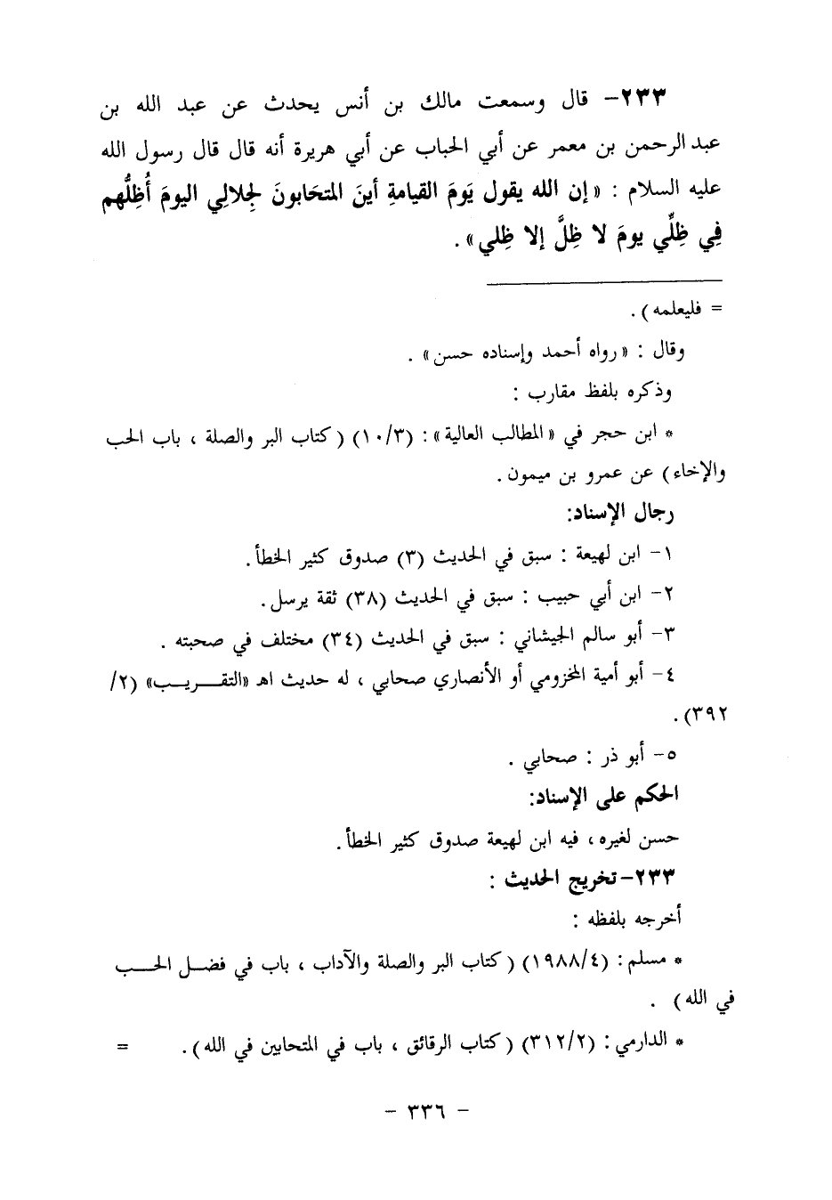 ٢٣٣ - وَسَمِعْتُ مَالِكَ بْنَ أَنَسٍ، يُحَدِّثُ عَنْ عَبْدِ اللَّهِ بْنِ عَبْدِ الرَّحْمَنِ بْنِ مَعْمَرٍ، عَنْ أَبِي الْحُبَابِ، عَنْ أَبِي هُرَيْرَةَ، أَنَّهُ قَالَ: قَالَ رَسُولُ اللَّهِ عَلَيْهِ السَّلَامُ: " إِنَّ اللَّهَ يَقُولُ يَوْمَ الْقِيَامَةِ: أَيْنَ الْمُتَحَابُّونَ لِجَلَالِي؟ الْيَوْمَ أُظِلُّهُمْ فِي ظِلِّي يَوْمَ لَا ظِلَّ إِلَّا ظِلِّي "