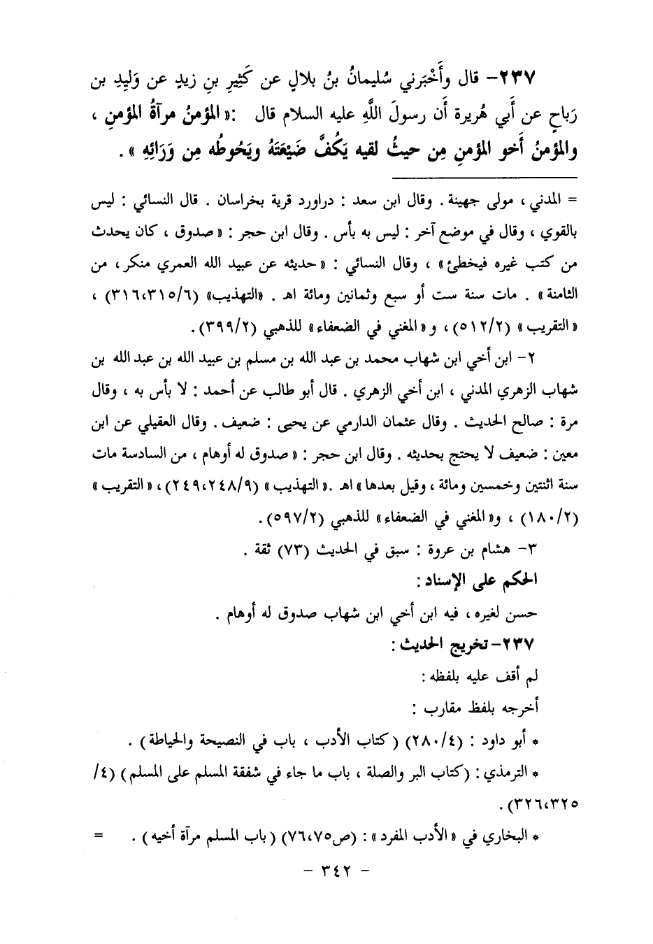 ٢٣٧ - وَأَخْبَرَنِي سُلَيْمَانُ بْنُ بِلَالٍ، عَنْ كَثِيرِ بْنِ زَيْدٍ، عَنْ وَلِيدِ بْنِ رَبَاحٍ، عَنْ أَبِي هُرَيْرَةَ، أَنَّ رَسُولَ اللَّهِ عَلَيْهِ السَّلَامُ قَالَ: «الْمُؤْمِنُ مِرْآةُ الْمُؤْمِنِ، وَالْمُؤْمِنُ أَخُو الْمُؤْمِنِ، مِنْ حَيْثُ لَقِيَهُ يَكُفُّ ضَيْعَتَهُ، وَيَحُوطُهُ مِنْ وَرَائِهِ»