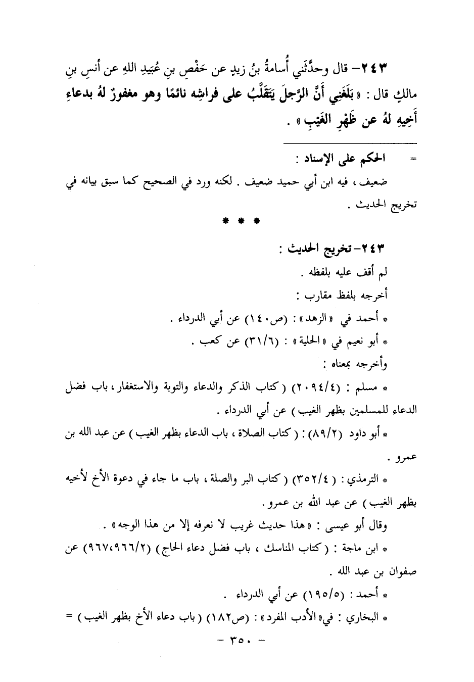 ٢٤٣ - وَحَدَّثَنِي أُسَامَةُ بْنُ زَيْدٍ، عَنْ حَفْصِ بْنِ عُبَيْدِ اللَّهِ، عَنْ أَنَسِ بْنِ مَالِكٍ، قَالَ: بَلَغَنِي «أَنَّ الرَّجُلَ، يَتَقَلَّبُ عَلَى فِرَاشِهِ نَائِمًا وَهُوَ مَغْفُورٌ لَهُ بِدُعَاءِ أَخِيهِ لَهُ، عَنْ ظَهْرِ الْغَيْبِ»