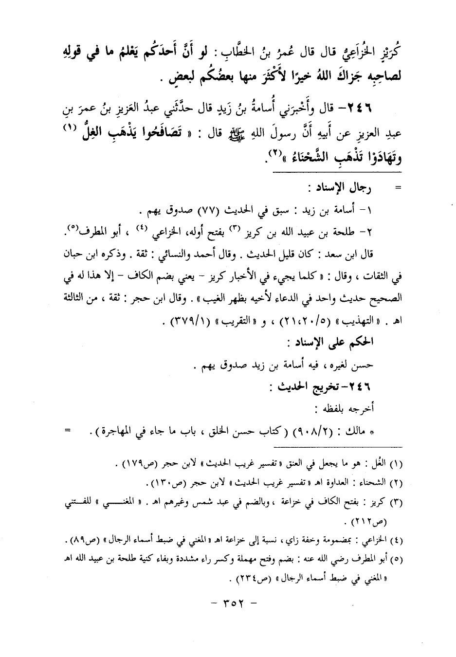 ٢٤٦ - وَأَخْبَرَنِي أُسَامَةُ بْنُ زَيْدٍ، قَالَ: حَدَّثَنِي عَبْدُ الْعَزِيزِ بْنُ عُمَرَ بْنِ عَبْدِ الْعَزِيزِ، عَنْ أَبِيهِ، أَنَّ رَسُولَ اللَّهِ صَلَّى اللهُ عَلَيْهِ وَسَلَّمَ قَالَ: «تَصَافَحُوا يَذْهَبِ الْغِلُّ، وَتَهَادَوْا تَذْهَبِ الشَّحْنَاءُ» ⦗٣٥٣⦘