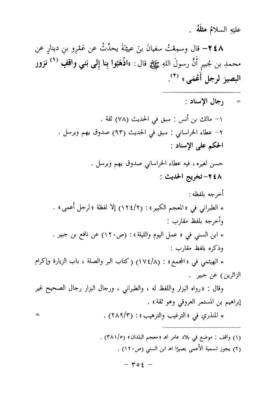 ٢٤٨ - وَسَمِعْتُ سُفْيَانَ بْنَ عُيَيْنَةَ، يُحَدِّثُ عَنْ عَمْرِو بْنِ دِينَارٍ، عَنْ مُحَمَّدِ بْنِ جُبَيْرٍ، أَنَّ رَسُولَ اللَّهِ صَلَّى اللهُ عَلَيْهِ وَسَلَّمَ قَالَ: «اذْهَبُوا بِنَا إِلَى بَنِي وَاقِفٍ نَزُورُ الْبَصِيرَ» . لِرَجُلٍ أَعْمَى " ⦗٣٥٥⦘