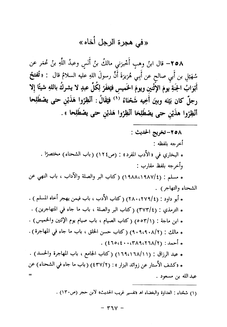 ٢٥٨ - قَالَ ابْنُ وَهْبٍ، أَخْبَرَنِي مَالِكُ بْنُ أَنَسٍ، وَعَبْدُ اللَّهِ بْنُ عُمَرَ، عَنْ سُهَيْلِ بْنِ أَبِي صَالِحٍ، عَنْ أَبِي هُرَيْرَةَ، أَنَّ رَسُولَ اللَّهِ عَلَيْهِ السَّلَامُ قَالَ: " تُفْتَحُ أَبْوَابُ الْجَنَّةِ يَوْمَ الِاثْنَيْنِ، وَيَوْمَ الْخَمِيسِ فَيُغْفَرُ لِكُلِّ عَبْدٍ لَا يُشْرِكُ بِاللَّهِ شَيْئًا، إِلَّا رَجُلٌ كَانَ بَيْنَهُ وَبَيْنَ أَخِيهِ شَحْنَاءُ، فَيُقَالُ: أَنْظِرُوا هَذَيْنِ حَتَّى يَصْطَلِحَا، أَنْظِرُوا هَذَيْنِ حَتَّى يَصْطَلِحَا، أَنْظِرُوا هَذَيْنِ حَتَّى يَصْطَلِحَا "