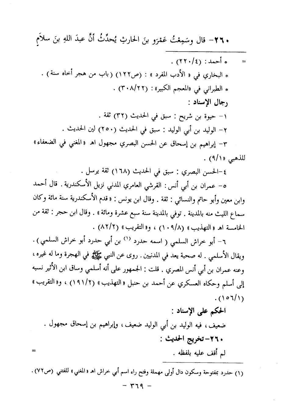 ٢٦٠ - وَسَمِعْتُ عَمْرَو بْنَ الْحَارِثِ، يُحَدِّثُ أَنَّ عَبْدَ اللَّهِ بْنَ سَلَامٍ ⦗٣٧٠⦘، وَكَعْبًا الْتَقَيَا، فَقَالَ أَحَدُهُمَا: " إِنِّي لَأَعْرِفُ لَيْلَةً فِي السَّنَةِ نَزَلَ اللَّهُ فِيهَا إِلَى سَمَاءِ الدُّنْيَا فَيَقُولُ: الْيَوْمَ أَغْفِرُ لِلْمُؤْمِنِينَ، وَأُمْلِي لِلْكَافِرِينَ، وَأَدَعُ أَهْلَ الْحِقْدِ حَتَّى يَخْلُوَ حِقْدُهُمْ، وَقَالَ الْآخَرُ: بَلْ هُنَّ كُلُّ لَيْلَةٍ "