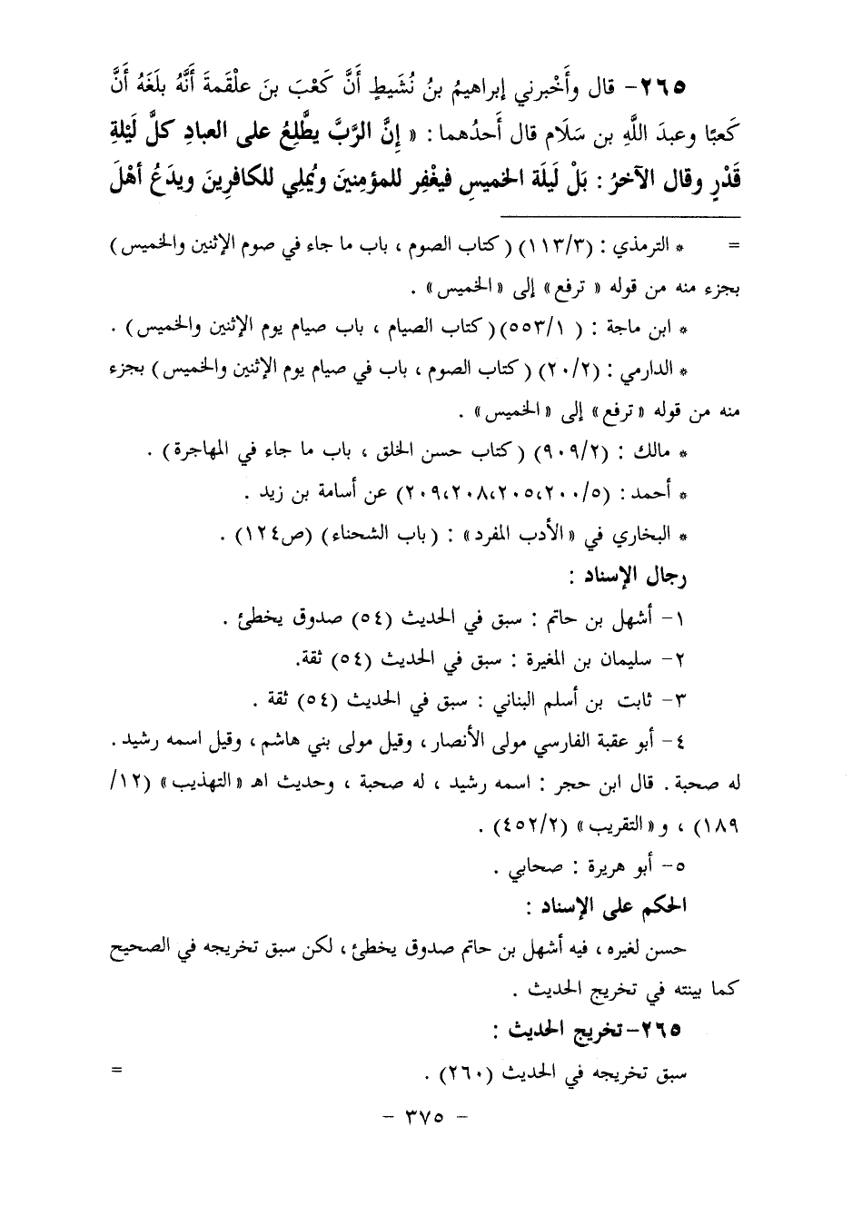 ٢٦٥ - وَأَخْبَرَنِي إِبْرَاهِيمُ بْنُ نَشِيطٍ، أَنَّ كَعْبَ بْنَ عَلْقَمَةَ، أَنَّهُ بَلَغَهُ أَنَّ كَعْبًا، وَعَبْدَ اللَّهِ بْنَ سَلَّامٍ قَالَ أَحَدُهُمَا: " إِنَّ الرَّبَّ يَطَّلِعُ عَلَى الْعِبَادِ كُلَّ لَيْلَةِ قَدْرٍ، وَقَالَ الْآخَرُ: بَلْ لَيْلَةُ الْخَمِيسِ، فَيَغْفِرُ لِلْمُؤْمِنِينَ وَيُمْلِي لِلْكَافِرِينَ، وَيَدَعُ أَهْلَ ⦗٣٧٦⦘ الْحِقْدِ حَتَّى يَنْحَلَّ حِقْدُهُمْ "