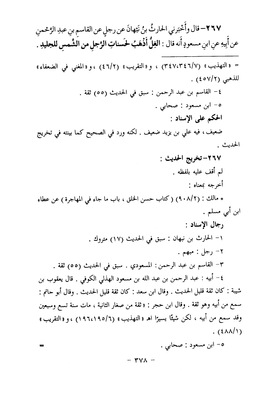 ٢٦٧ - وَأَخْبَرَنِي الْحَارِثُ بْنُ نَبْهَانَ، عَنْ رَجُلٍ، عَنِ الْقَاسِمِ بْنِ عَبْدِ الرَّحْمَنِ، عَنْ أَبِيهِ، عَنِ ابْنِ مَسْعُودِ، أَنَّهُ قَالَ: «الْغِلُّ أَذْهَبُ لِحَسَنَاتِ الرَّجُلِ مِنَ الشَّمْسِ لِلْجَلِيدِ»