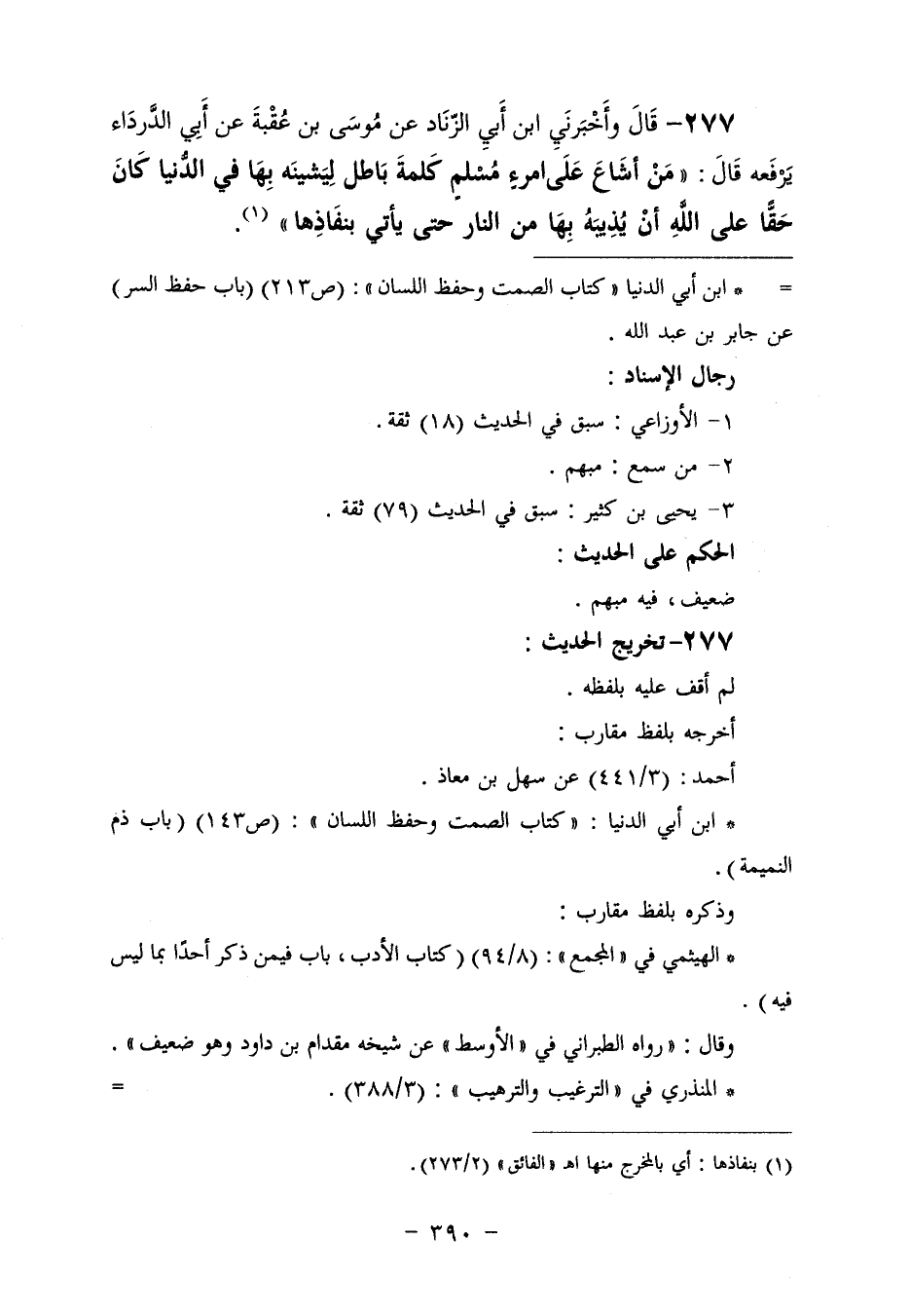 ٢٧٧ - وَأَخْبَرَنِي ابْنُ أَبِي الزِّنَادِ، عَنْ مُوسَى بْنِ عُقْبَةَ، عَنْ أَبِي الدَّرْدَاءِ، يَرْفَعْهُ قَالَ: «مَنْ أَشَاعَ عَلَى امْرِئٍ مُسْلِمٍ كَلِمَةَ بَاطِلٍ لِيُشِينَهُ بِهَا فِي الدُّنْيَا كَانَ حَقًّا عَلَى اللَّهِ أَنْ يُذِيبَهُ بِهَا مِنَ النَّارِ حَتَّى يَأْتِيَ بِنَفَاذِهَا»