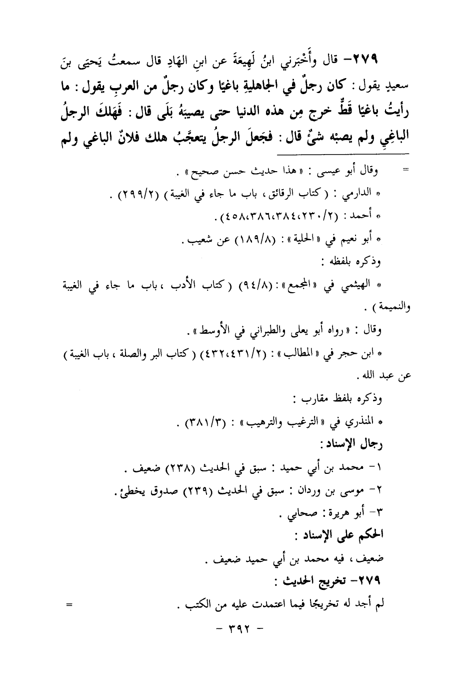 ٢٧٩ - وَأَخْبَرَنِي ابْنُ لَهِيعَةَ، عَنِ ابْنِ الْهَادِ، قَالَ: سَمِعْتُ يَحْيَى بْنَ سَعِيدٍ، يَقُولُ: " كَانَ رَجُلٌ فِي الْجَاهِلِيَّةِ بَاغِيًا، وَكَانَ رَجُلٌ مِنَ الْعَرَبِ يَقُولُ: مَا رَأَيْتُ بَاغِيًا قَطُّ خَرَجَ مِنْ هَذِهِ الدُّنْيَا حَتَّى يُصِيبَهُ بِلًى. قَالَ: فَهَلَكَ الرَّجُلُ الْبَاغِي وَلَمْ يُصِبْهُ شَيْءٌ، قَالَ: فَجَعَلَ الرَّجُلُ يَتَعَجَّبُ: هَلَكَ فُلَانٌ الْبَاغِي وَلَمْ ⦗٣٩٣⦘ يُصِبْهُ شَيْءٌ، فَوَاللَّهِ إِنِّي لَا أَظُنُّ فِيمَا بَعْدَ الْمَوْتِ جَزَاءً "