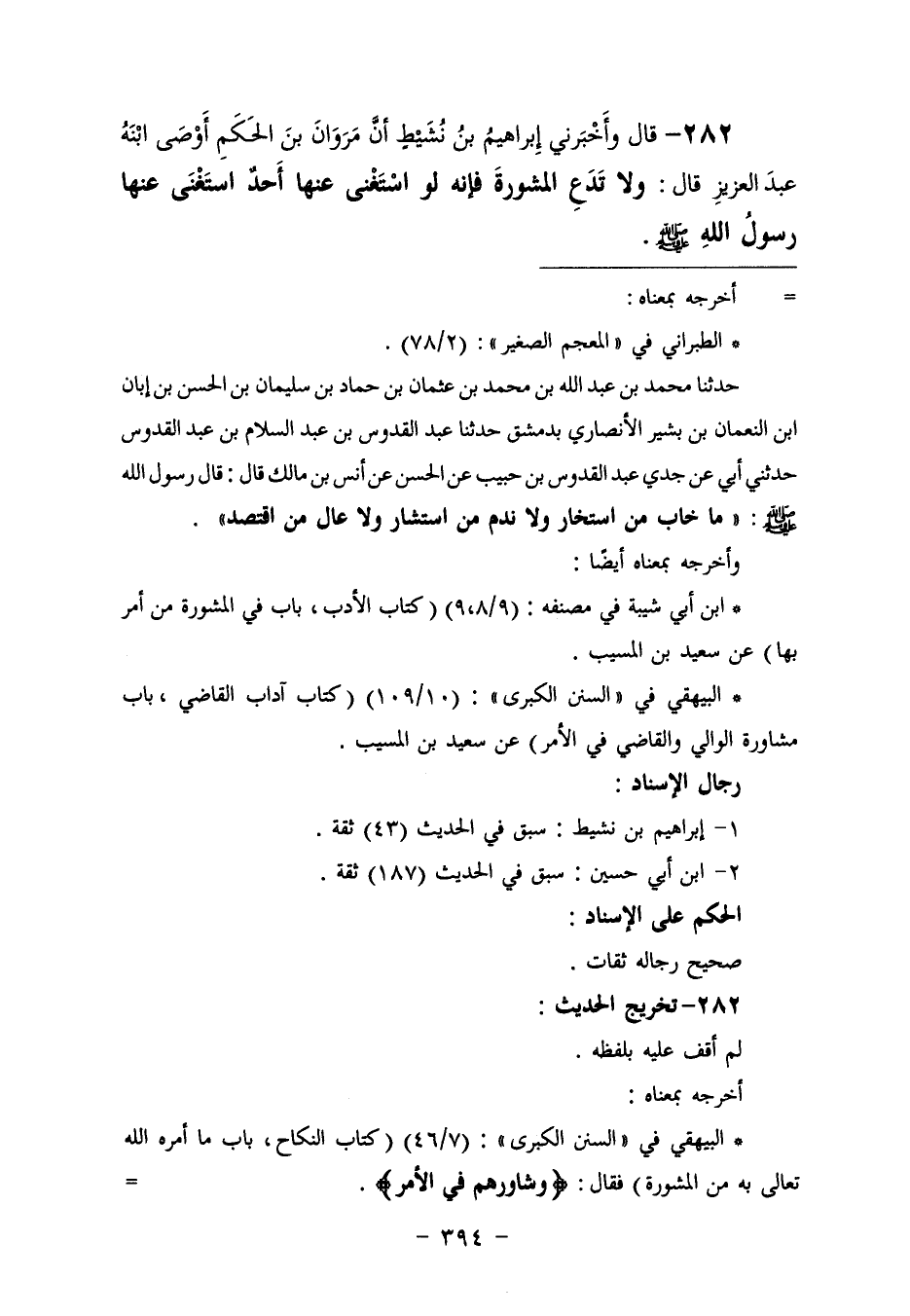٢٨٢ - وَأَخْبَرَنِي إِبْرَاهِيمُ بْنُ نَشِيطٍ، أَنَّ مَرْوَانَ بْنَ الْحَكَمِ، أَوْصَى ابْنَهُ عَبْدَ الْعَزِيزِ قَالَ: «وَلَا تَدَعِ الْمَشُورَةَ، فَإِنَّهُ لَوِ اسْتَغْنَى عَنْهَا أَحَدٌ اسْتَغْنَى عَنْهَا رَسُولُ اللَّهِ صَلَّى اللهُ عَلَيْهِ وَسَلَّمَ»
