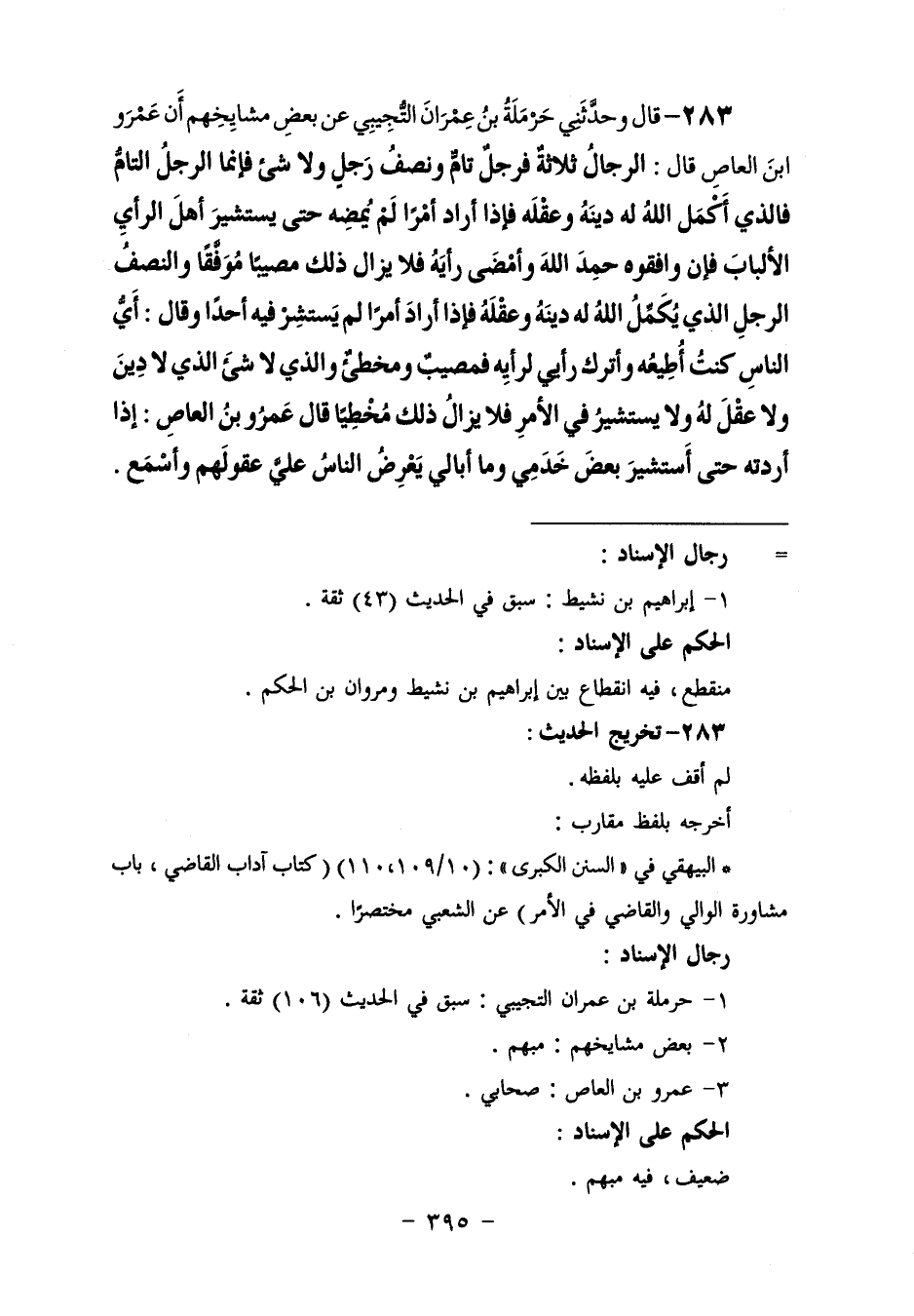 ٢٨٣ - وَحَدَّثَنِي حَرْمَلَةُ بْنُ عِمْرَانَ التُّجِيبِيُّ، عَنْ بَعْضِ مَشَايِخِهِمْ، أَنَّ عَمْرَو بْنَ الْعَاصِ، قَالَ: " الرِّجَالُ ثَلَاثَةٌ: فَرَجُلٌ تَامٌّ، وَنِصْفُ رَجُلٍ، وَلَا شَيْءَ، فَإِنَّمَا الرَّجُلُ التَّامُّ فَالَّذِي أَكْمَلَ اللَّهُ لَهُ دِينَهُ وَعَقْلَهُ، فَإِذَا أَرَادَ أَمْرًا لَمْ يُمْضِهِ حَتَّى يَسْتَشِيرَ أَهْلَ الرَّأْيِ الْأَلْبَابَ، فَإِنْ وَافَقُوهُ حَمِدَ اللَّهَ وَأَمْضَى رَأْيَهُ فَلَا يَزَالُ ذَلِكَ مُصِيبًا مُوَفَّقًا، وَالنِّصْفُ الرَّجُلِ الَّذِي يُكَمِّلُ اللَّهُ لَهُ دِينَهُ وَعَقْلَهُ، فَإِذَا أَرَادَ أَمْرًا لَمْ يَسْتَشِرْ فِيهِ أَحَدًا، وَقَالَ: أَيُّ النَّاسِ كُنْتُ أُطِيعُهُ وَأَتْرُكُ رَأْيِي لِرَأْيِهِ، فَمُصِيبٌ وَمُخْطِئٌ، وَالَّذِي لَا شَيءَ الَّذِي لَا دِينَ وَلَا عَقْلَ لَهُ وَلَا يَسْتَشِيرُ فِي الْأَمْرِ فَلَا يَزَالُ ذَلِكَ مُخْطِئًا. قَالَ عَمْرُو بْنُ الْعَاصِ: إِذَا أَرَدْتُهُ حَتَّى أَسْتَشِيرَ بَعْضَ خَدَمِي، وَمَا أُبَالِي يَعْرِضُ النَّاسُ عَلَيَّ عُقُولَهَمْ وَأَسْمَعُ "