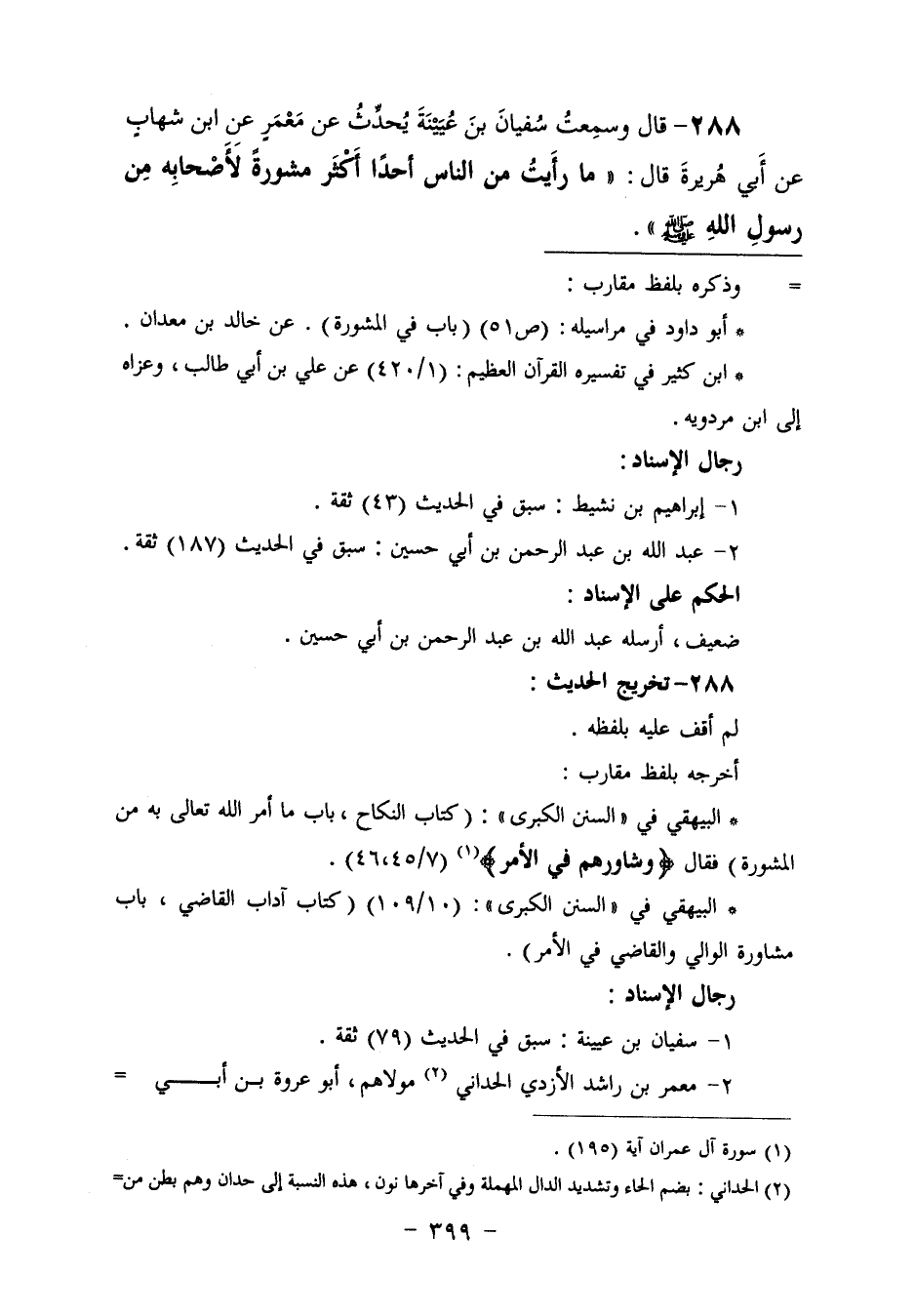٢٨٨ - وَسَمِعْتُ سُفْيَانَ بْنَ عُيَيْنَةَ، يُحَدِّثُ عَنْ مَعْمَرٍ، عَنِ ابْنِ شِهَابٍ، عَنْ أَبِي هُرَيْرَةَ، قَالَ: «مَا رَأَيْتُ مِنَ النَّاسِ أَحَدًا أَكْثَرَ مَشُورَةٍ لِأَصْحَابِهِ مِنْ رَسُولِ اللَّهِ صَلَّى اللهُ عَلَيْهِ وَسَلَّمَ»