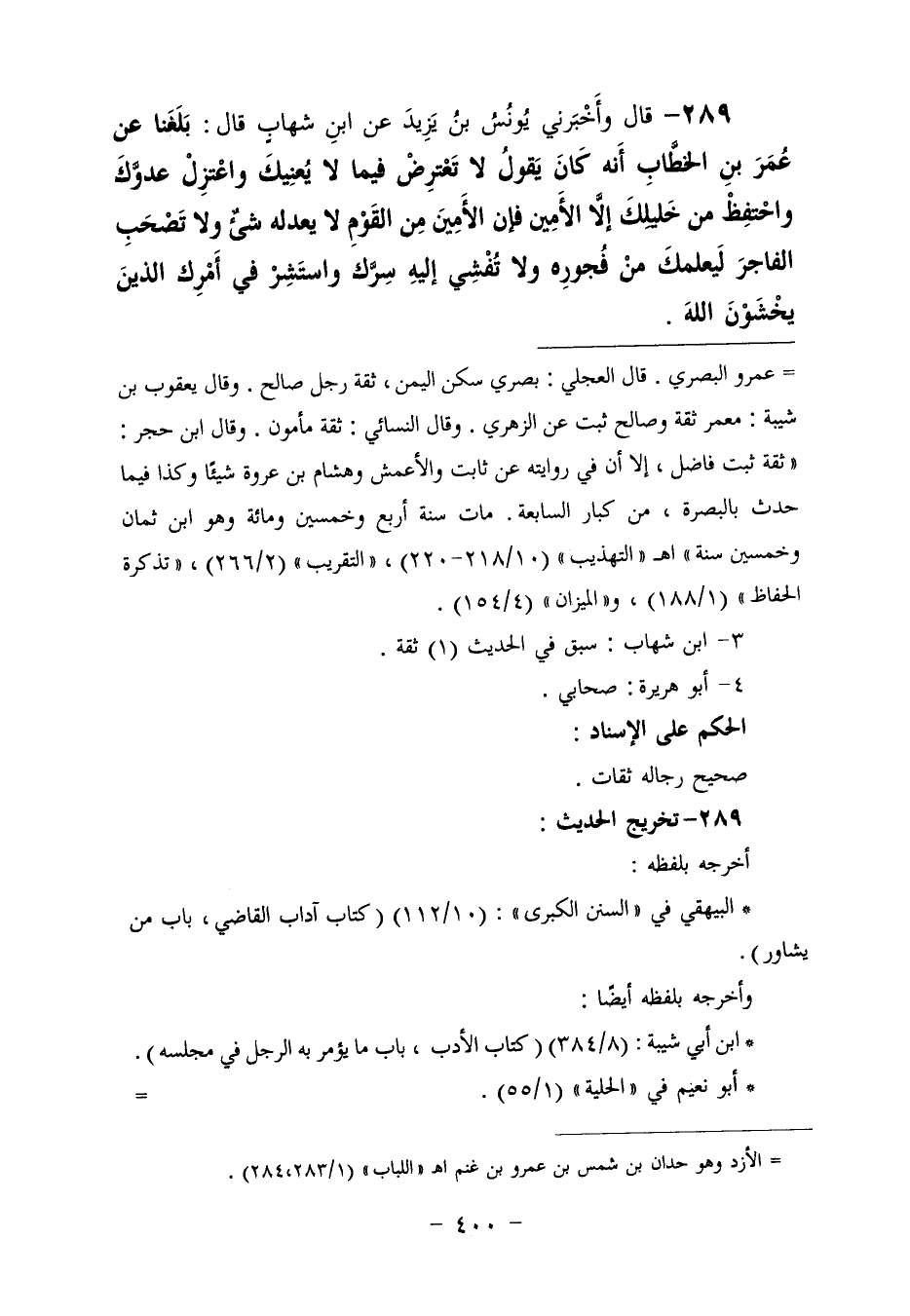 ٢٨٩ - وَأَخْبَرَنِي يُونُسُ بْنُ يَزِيدَ، عَنِ ابْنِ شِهَابٍ، قَالَ: بَلَغَنَا عَنْ عُمَرَ بْنِ الْخَطَّابِ، أَنَّهُ كَانَ يَقُولُ: «لَا تَعْتَرِضْ فِيمَا لَا يُعْنِيكَ، وَاعْتَزِلْ عَدُوَّكَ، وَاحْتَفِظْ مِنْ خَلِيلِكَ إِلَّا الْأَمِينَ، فَإِنَّ الْأَمِينَ مِنَ الْقَوْمِ لَا يَعْدِلُهُ شَيْءٌ، وَلَا تَصْحَبِ الْفَاجِرَ لِيُعَلِّمَكَ مِنْ فُجُورِهِ، وَلَا تُفْشِ إِلَيْهِ سَرَّكَ، وَاسْتَشِرْ فِي أَمْرِكِ الَّذِينَ يَخْشَوْنَ اللَّهَ»