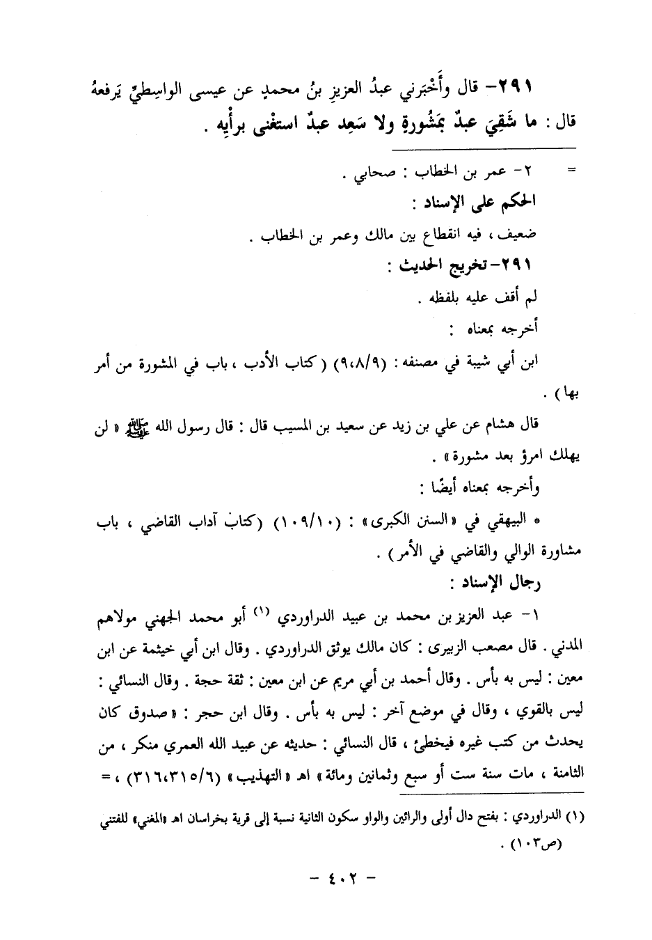 ٢٩١ - وَأَخْبَرَنِي عَبْدُ الْعَزِيزِ بْنُ مُحَمَّدٍ، عَنْ عِيسَى الْوَاسِطِيِّ، يَرْفَعْهُ قَالَ: «مَا شَقِيَ عَبْدٌ بِمَشُورَةٍ، وَلَا سَعِدَ عَبْدٌ اسْتَغْنَى بِرَأْيهِ»