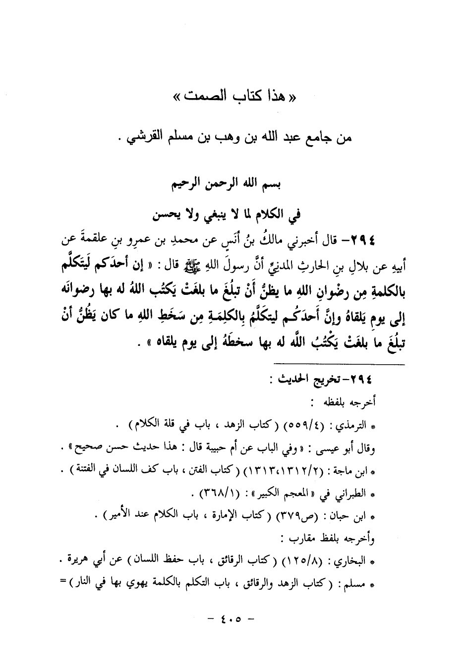 هَذَا كِتَابُ الصَّمْتِ مِنْ جَامِعِ عَبْدِ اللَّهِ بْنِ وَهْبِ بْنِ مُسْلِمٍ الْقُرَشِيِّ