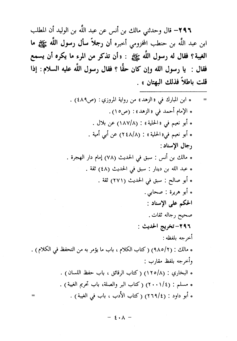 ٢٩٦ - وَحَدَّثَنِي مَالِكُ بْنُ أَنَسٍ، عَنْ عَبْدِ اللَّهِ بْنِ الْوَلِيدِ، أَنَّ الْمُطَّلِبَ بْنَ عَبْدِ اللَّهِ بْنِ حَنْطَبٍ الْمَخْزُومِيَّ، أَخْبَرَهُ أَنَّ رَجُلًا سَأَلَ رَسُولَ اللَّهِ صَلَّى اللهُ عَلَيْهِ وَسَلَّمَ: مَا الْغِيبَةُ؟ فَقَالَ لَهُ رَسُولُ اللَّهِ صَلَّى اللهُ عَلَيْهِ وَسَلَّمَ: «أَنْ تَذْكُرَ مِنَ الْمَرْءِ مَا يَكْرَهُ أَنْ يَسْمَعَ» ، فَقَالَ: يَا رَسُولَ اللَّهِ، وَإِنْ كَانَ حَقًّا؟، فَقَالَ رَسُولُ اللَّهِ عَلَيْهِ السَّلَامُ: «إِذَا قُلْتَ بَاطِلًا فَذَلِكَ الْبُهْتَانُ»