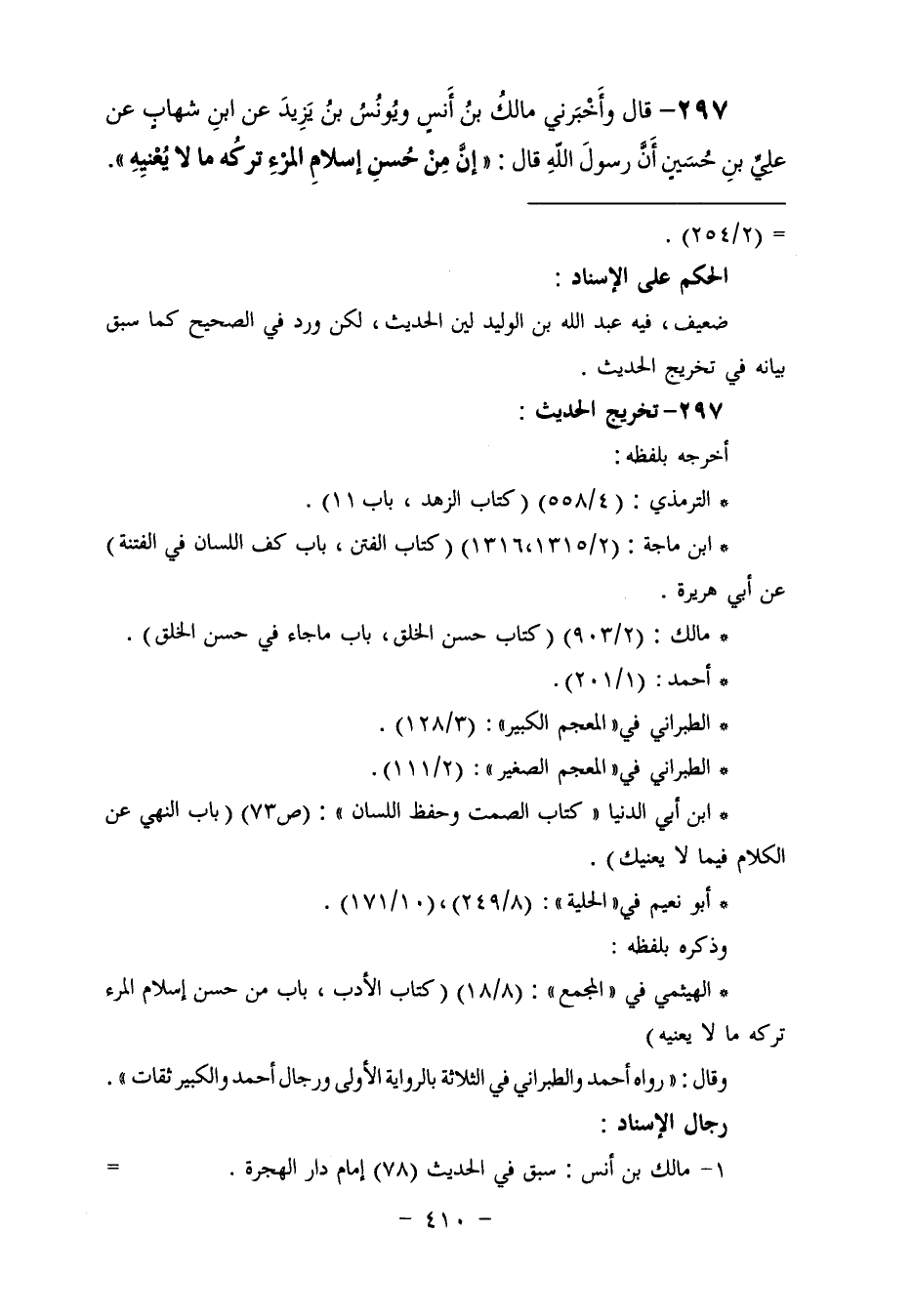 ٢٩٧ - وَأَخْبَرَنِي مَالِكُ بْنُ أَنَسٍ، وَيُونُسُ بْنُ يَزِيدَ، عَنِ ابْنِ شِهَابٍ، عَنْ عَلِيِّ بْنِ حُسَيْنٍ، أَنَّ رَسُولَ اللَّهِ قَالَ: «إِنَّ مِنْ حُسْنِ إِسْلَامِ الْمَرْءِ تَرْكُهُ مَا لَا يَعْنِيهِ»