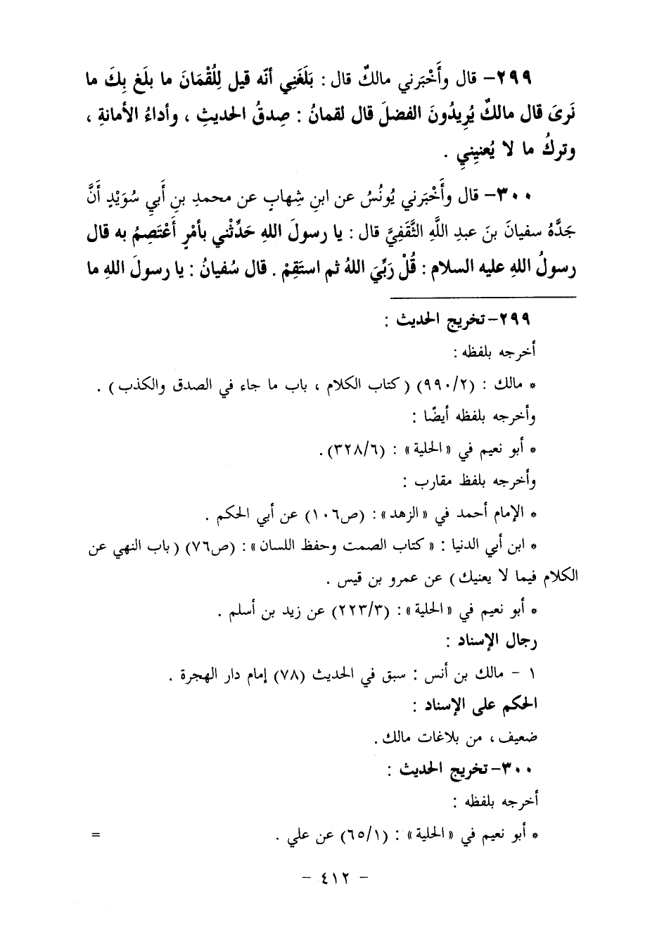 ٢٩٩ - وَأَخْبَرَنِي مَالِكٌ، قَالَ: بَلَغَنِي أَنَّهُ قِيلَ لِلُقْمَانَ مَا بَلَغَ بِكَ مَا نَرَى؟ قَالَ مَالِكٌ: يُرِيدُونَ الْفَضْلَ، قَالَ لُقْمَانُ: «صِدْقُ الْحَدِيثِ، وَأَدَاءُ الْأَمَانَةِ، وَتَرْكُ مَا لَا يَعْنِينِي»