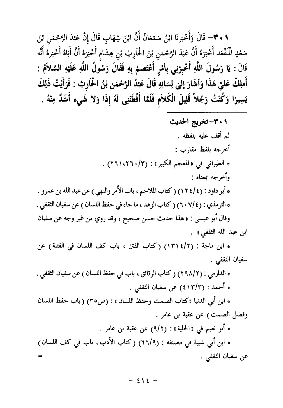 ٣٠١ - وَأَخْبَرَنَا ابْنُ سَمْعَانَ، أَنَّ ابْنَ شِهَابٍ، قَالَ: إِنَّ عَبْدَ الرَّحْمَنِ بْنَ سَعْدٍ الْمُقْعَدَ، أَخْبَرَهُ أَنَّ عَبْدُ الرَّحْمَنِ بْنُ الْحَارِثِ بْنِ هِشَامٍ أَخْبَرَهُ، أَنَّ أَبَاهُ أَخْبَرَهُ، أَنَّهُ قَالَ: " يَا رَسُولَ اللَّهِ أَخْبَرَنِي بِأَمْرٍ، أَعْتَصِمُ بِهِ، فَقَالَ رَسُولُ اللَّهِ عَلَيْهِ السَّلَامُ: «أَمْلِكْ عَلَيْكَ هَذَا» وَأَشَارَ إِلَى لِسَانِهِ. قَالَ عَبْدُ الرَّحْمَنِ بْنُ الْحَارِثِ: فَرَأَيْتُ ذَلِكَ يَسِيرًا، وَكُنْتُ رَجُلًا قَلِيلَ الْكَلَامِ، فَلَمَّا أَفْطَنَنِي لَهُ إِذَا وَلَا شَيْءَ أَشَدَّ مِنْهُ "