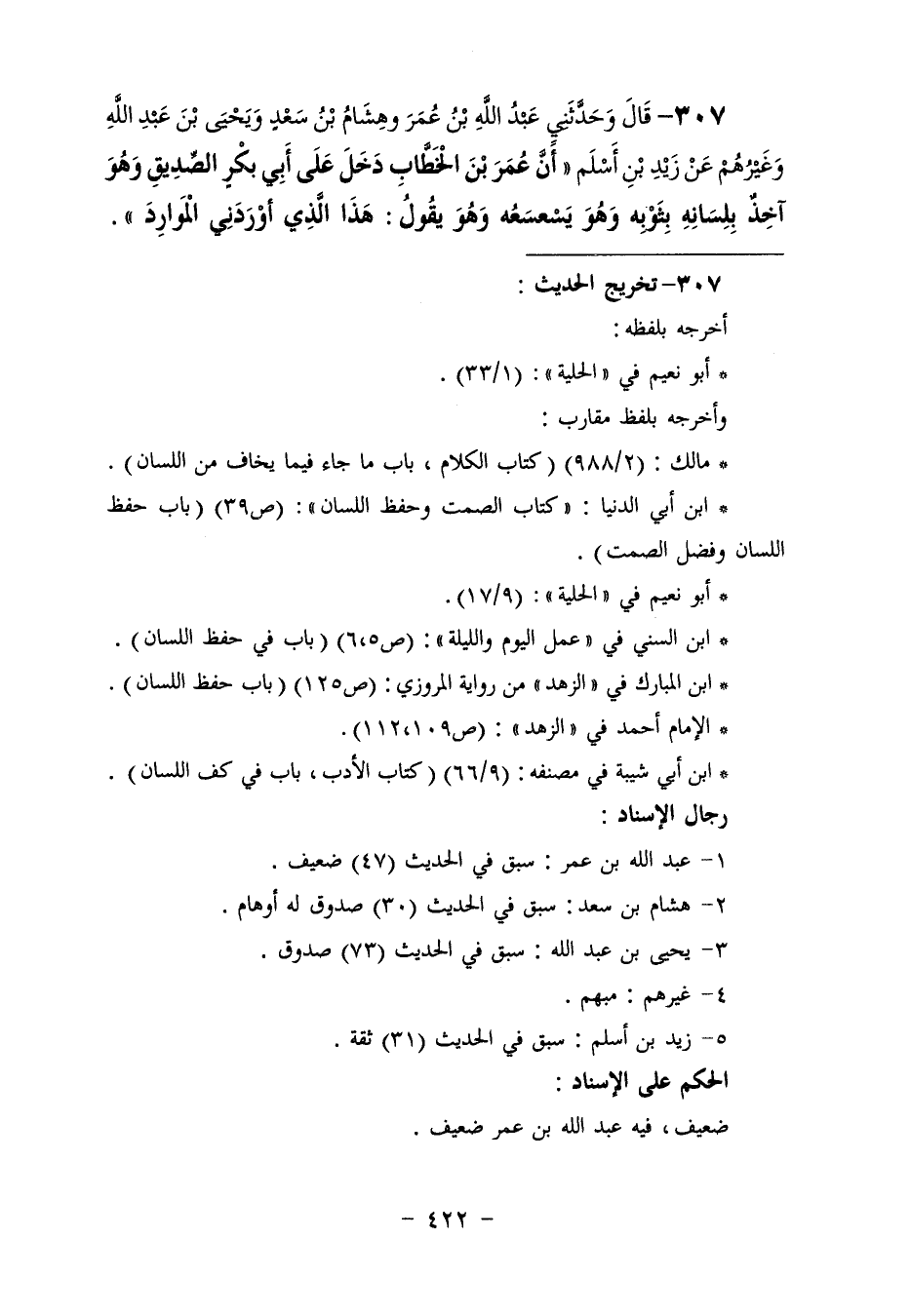 ٣٠٧ - وَحَدَّثَنِي عَبْدُ اللَّهِ بْنُ عُمَرَ، وَهِشَامُ بْنُ سَعْدٍ، وَيَحْيَى بْنُ عَبْدِ اللَّهِ، وَغَيْرُهُمْ عَنْ زَيْدِ بْنِ أَسْلَمَ: " أَنَّ عُمَرَ بْنَ الْخَطَّابِ، دَخَلَ عَلَى أَبِي بَكْرٍ الصِّدِّيقِ، وَهُوَ آخِذٌ بِلِسَانِهِ بِثَوْبِهِ، وَهُوَ يَسْعِسَعُهُ وَهُوَ يَقُولُ: «هَذَا الَّذِي أَوْرَدَنِي الْمَوَارِدَ»