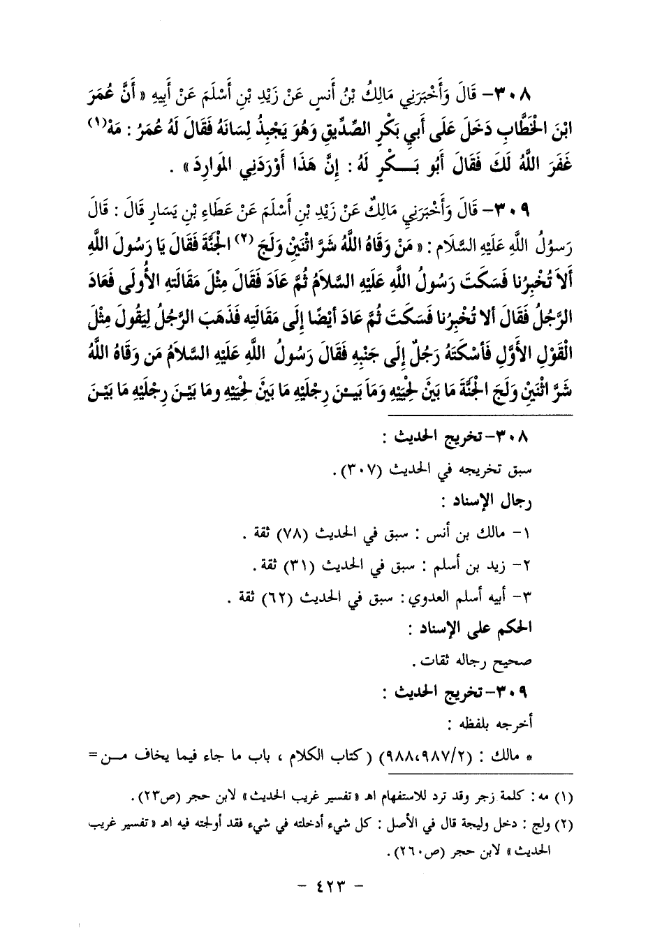 ٣٠٨ - وَأَخْبَرَنِي مَالِكُ بْنُ أَنَسٍ، عَنْ زَيْدِ بْنِ أَسْلَمَ، عَنْ أَبِيهِ: أَنَّ عُمَرَ بْنَ الْخَطَّابِ، دَخَلَ عَلَى أَبِي بَكْرٍ الصِّدِّيقِ وَهُوَ يَجْبِذُ لِسَانَهُ، فَقَالَ لَهُ عُمَرُ: مَهْ، غَفَرَ اللَّهُ لَكَ، فَقَالَ أَبُو بَكْرٍ لَهُ: «إِنَّ هَذَا أَوْرَدَنِي الْمَوَارِدَ»