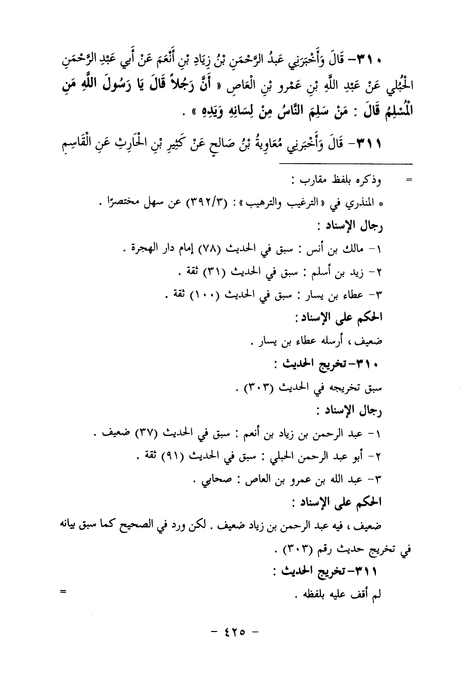 ٣١٠ - وَأَخْبَرَنِي عَبْدُ الرَّحْمَنِ بْنُ زِيَادِ بْنِ أَنْعَمَ، عَنْ أَبِي عَبْدِ الرَّحْمَنِ الْحُبُلِيِّ، عَنْ عَبْدِ اللَّهِ بْنِ عَمْرِو بْنِ الْعَاصِ: أَنَّ رَجُلًا، قَالَ: يَا رَسُولَ اللَّهِ , مَنِ الْمُسْلِمُ؟ قَالَ: «مَنْ سَلِمَ النَّاسَ مِنْ لِسَانِهِ وَيَدِهِ»