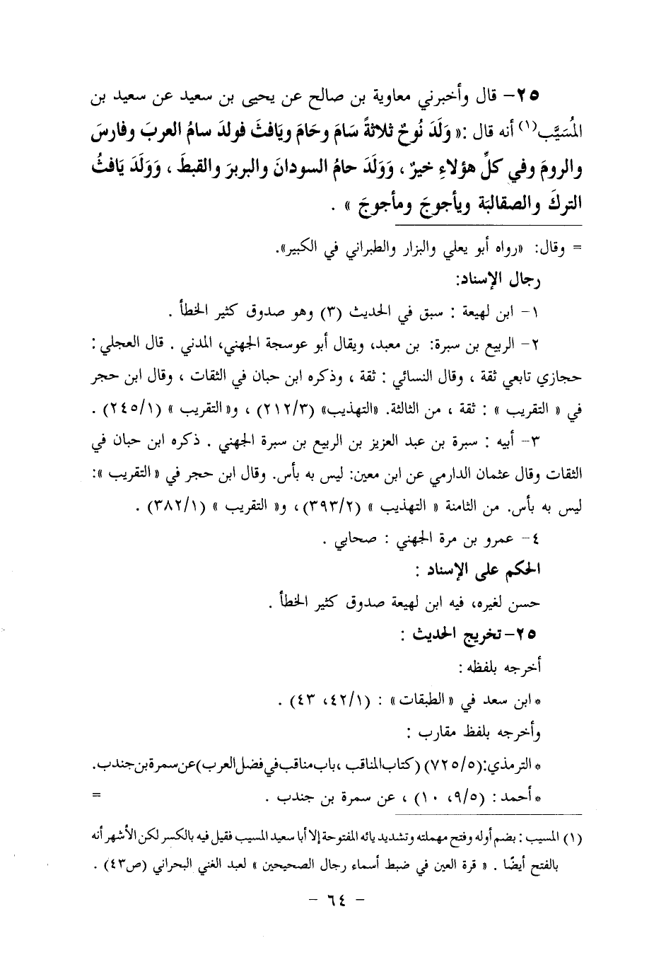 ٢٥ - وَأَخْبَرَنِي مُعَاوِيَةُ بْنُ صَالِحٍ، عَنْ يَحْيَى بْنِ سَعِيدٍ، عَنْ سَعِيدِ بْنِ الْمُسَيِّبِ، أَنَّهُ قَالَ: " وَلَدَ نُوحٌ ثَلَاثَةً: سَامَ، وَحَامَ، وَيَافِثَ، فَوَلَدَ سَامُ الْعَرَبَ وَفَارِسَ، وَالرُّومَ، وَفِي كُلِّ هَؤُلَاءِ خَيْرٌ، وَوَلَدَ حَامَ: السُّودَانَ، وَالْبَرْبَرَ، وَالْقِبْطَ، وَوَلَدَ يَافِثُ التُّرْكَ، وَالصَّقَالِبَةَ، وَيَأْجُوجَ وَمَأْجُوجَ "