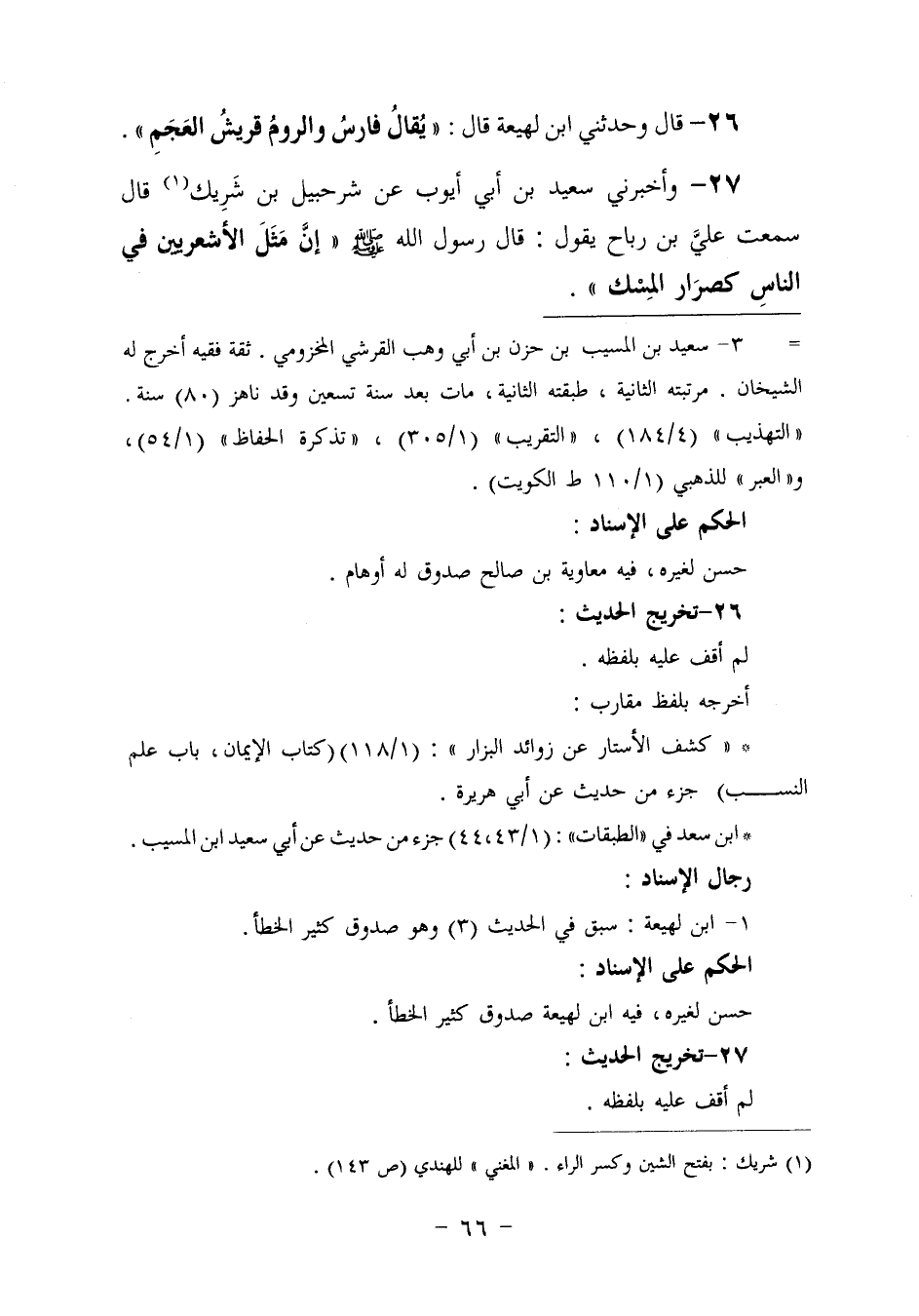 ٢٦ - قَالَ: وَحَدَّثَنِي ابْنُ لَهِيعَةَ، قَالَ: «يُقَالُ فَارِسُ وَالرُّومُ قُرَيْشُ الْعَجَمِ»