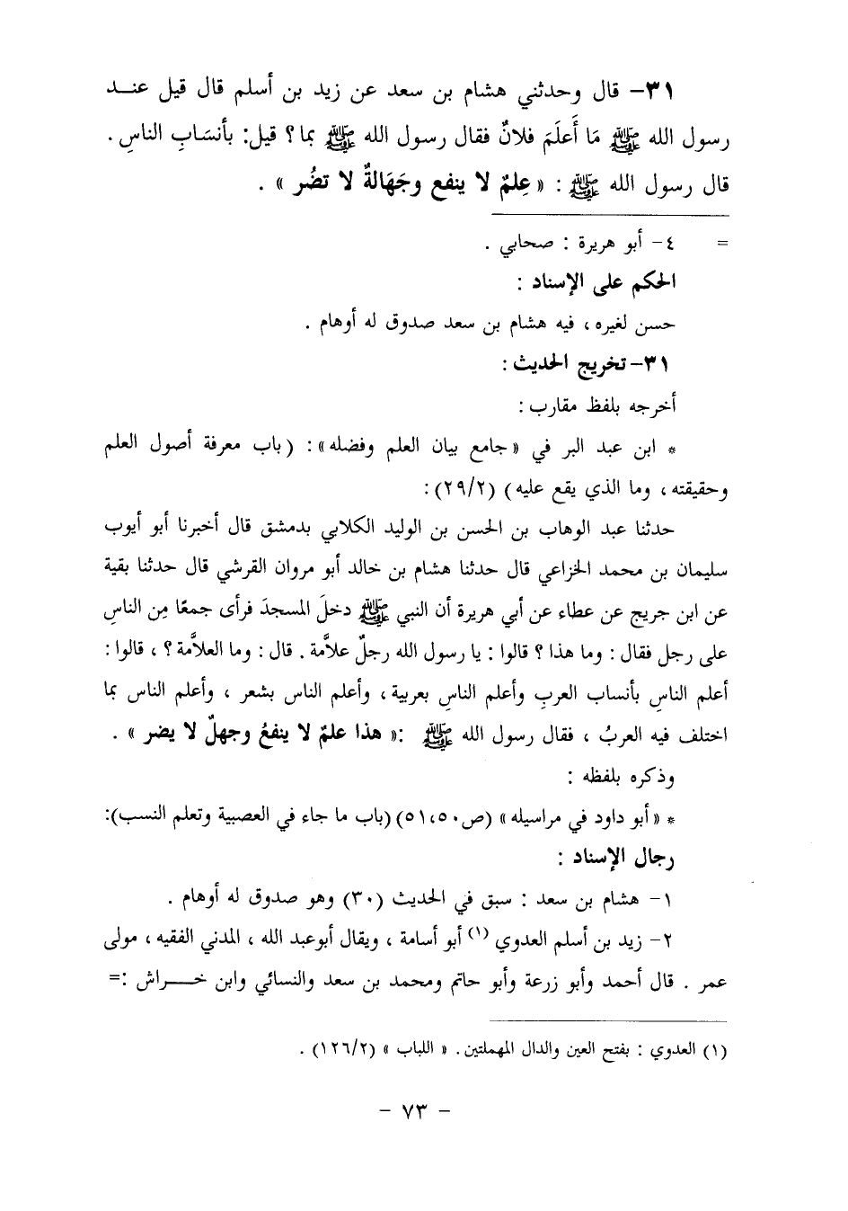 ٣١ - قَالَ: وَحَدَّثَنِي هِشَامُ بْنُ سَعْدٍ، عَنْ زَيْدِ بْنِ أَسْلَمَ قَالَ: قِيلِ عِنْدَ رَسُولِ اللَّهِ صَلَّى اللهُ عَلَيْهِ وَسَلَّمَ مَا أَعْلَمَ فُلَانًا؟ فَقَالَ رَسُولُ اللَّهِ صَلَّى اللهُ عَلَيْهِ وَسَلَّمَ: «بِمَ؟» قِيلَ: بَأَنْسَابِ النَّاسِ. قَالَ رَسُولُ اللَّهِ صَلَّى اللهُ عَلَيْهِ وَسَلَّمَ: «عِلْمٌ لَا يَنْفَعُ، وَجَهَالَةٌ لَا تَضُرُّ»