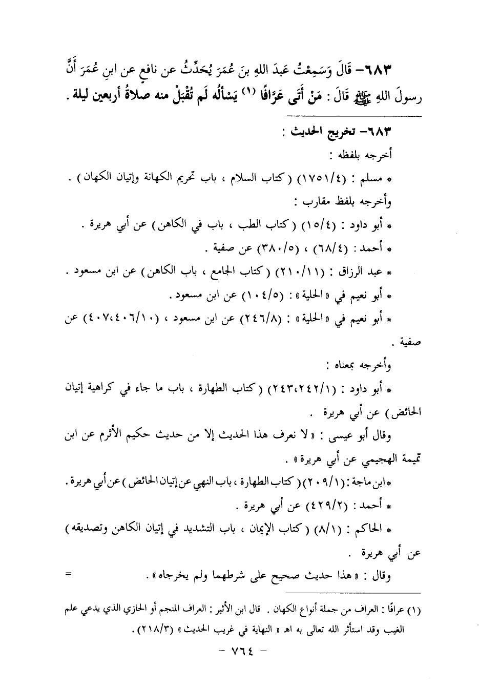 ٦٨٣ - وَسَمِعْتُ عَبْدَ اللَّهِ بْنَ عُمَرَ، يُحَدِّثُ عَنْ نَافِعٍ، عَنِ ابْنِ عُمَرَ، أَنَّ رَسُولَ اللَّهِ صَلَّى اللهُ عَلَيْهِ وَسَلَّمَ , قَالَ: «مَنْ أَتَى عَرَّافًا يَسْأَلُهُ لَمْ تُقْبَلْ مِنْهُ صَلَاةٌ أَرْبَعِينَ لَيْلَةً»
