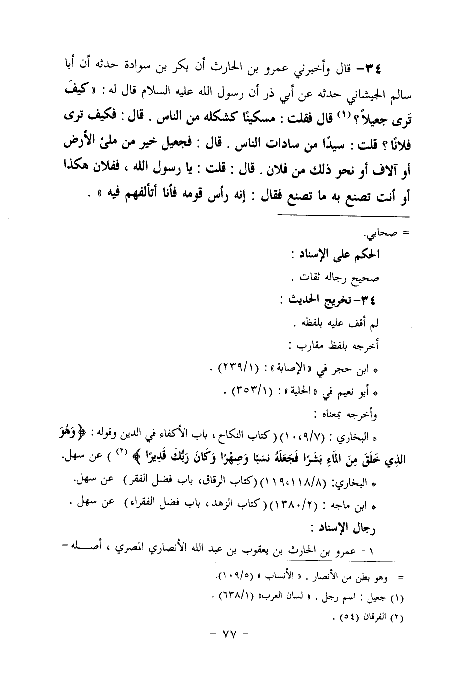 ٣٤ - وَأَخْبَرَنِي عَمْرُو بْنُ الْحَارِثِ، أَنَّ بَكْرَ بْنَ سَوَادَةَ حَدَّثَهُ، أَنَّ أَبَا سَالِمٍ الْجَيْشَانِيَّ حَدَّثَهُ، عَنْ أَبِي ذَرٍّ، أَنَّ رَسُولَ اللَّهِ عَلَيْهِ السَّلَامُ قَالَ لَهُ: «كَيْفَ تَرَى جُعَيْلًا؟» قَالَ: فَقُلْتُ: مِسْكِينًا كَشَكْلِهِ مِنَ النَّاسِ. قَالَ: «فَكَيْفَ تَرَى فُلَانًا؟» قُلْتُ: سَيِّدًا مِنْ سَادَاتِ النَّاسِ. قَالَ: «فَجُعَيْلٌ خَيْرٌ مِنْ مِلْءِ الْأَرْضِ أَوْ آلَافٍ أَوْ نَحْوِ ذَلِكَ مِنْ فُلَانٍ» . قَالَ: قُلْتُ: يَا رَسُولَ اللَّهِ، فَفُلَانٌ هَكَذَا أَوْ أَنْتَ تَصْنَعُ بِهِ مَا تَصْنَعُ؟ فَقَالَ: إِنَّهُ رَأْسُ قَوْمِهِ، فَأَنَا أَتَأَلَّفُهُمْ فِيهِ "