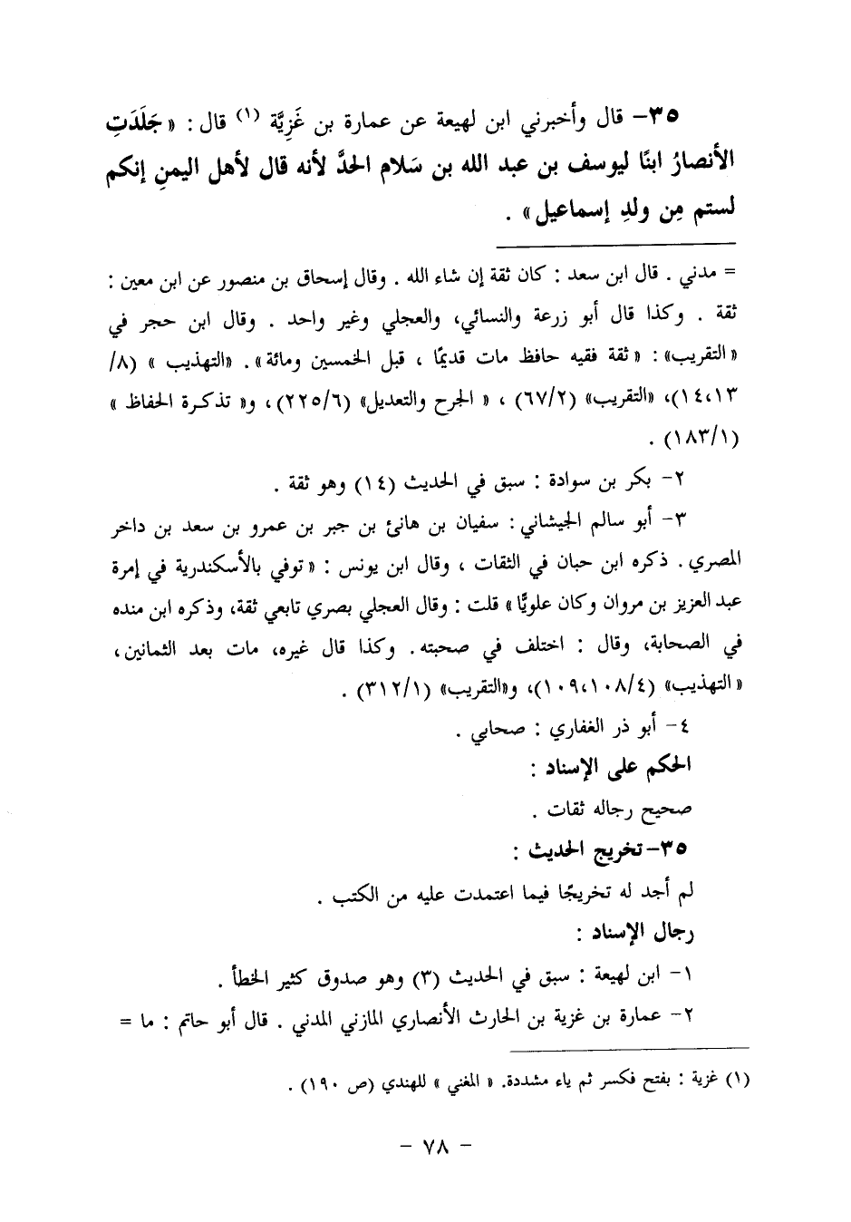 ٣٥ - وَأَخْبَرَنِي ابْنُ لَهِيعَةَ، عَنْ عُمَارَةَ بْنِ غَزِيَّةَ، قَالَ: " جَلَدَتِ الْأَنْصَارُ ابْنًا لِيُوسُفَ بْنِ عَبْدِ اللَّهِ بْنِ سَلَامٍ الْحَدَّ لِأَنَّهُ قَالَ لِأَهْلِ الْيَمَنِ: إِنَّكُمْ لَسْتُمْ مِنْ وَلَدِ إِسْمَاعِيلَ "