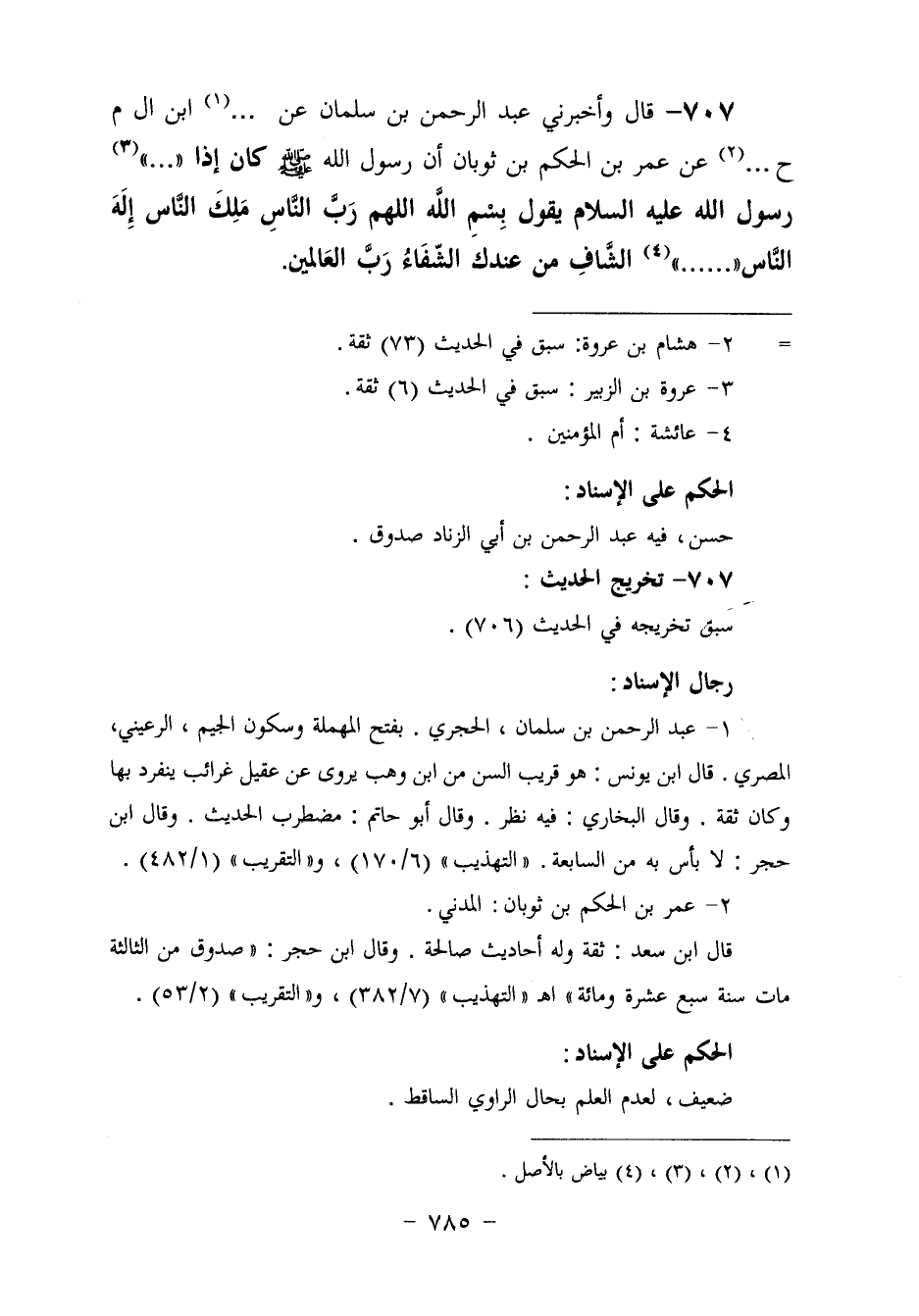 ٧٠٧ - وَأَخْبَرَنِي عَبْدُ الرَّحْمَنِ بْنُ سَلْمَانَ، عَنِ ابْنِ. .، عَنْ عُمَرَ بْنِ الْحَكَمِ بْنِ ثَوْبَانَ، أَنَّ رَسُولَ اللَّهِ صَلَّى اللهُ عَلَيْهِ وَسَلَّمَ كَانَ إِذَا. . . . . . رَسُول اللَّهِ عَلَيْهِ السَّلَامُ , يَقُولُ: «بِسْمِ اللَّهِ اللَّهُمَّ رَبَّ النَّاسِ، مَلِكَ النَّاسِ إِلَهَ النَّاسِ. . . . الشَّافِي، مِنْ عِنْدِكَ الشِّفَاءُ رَبَّ الْعَالَمِينَ»