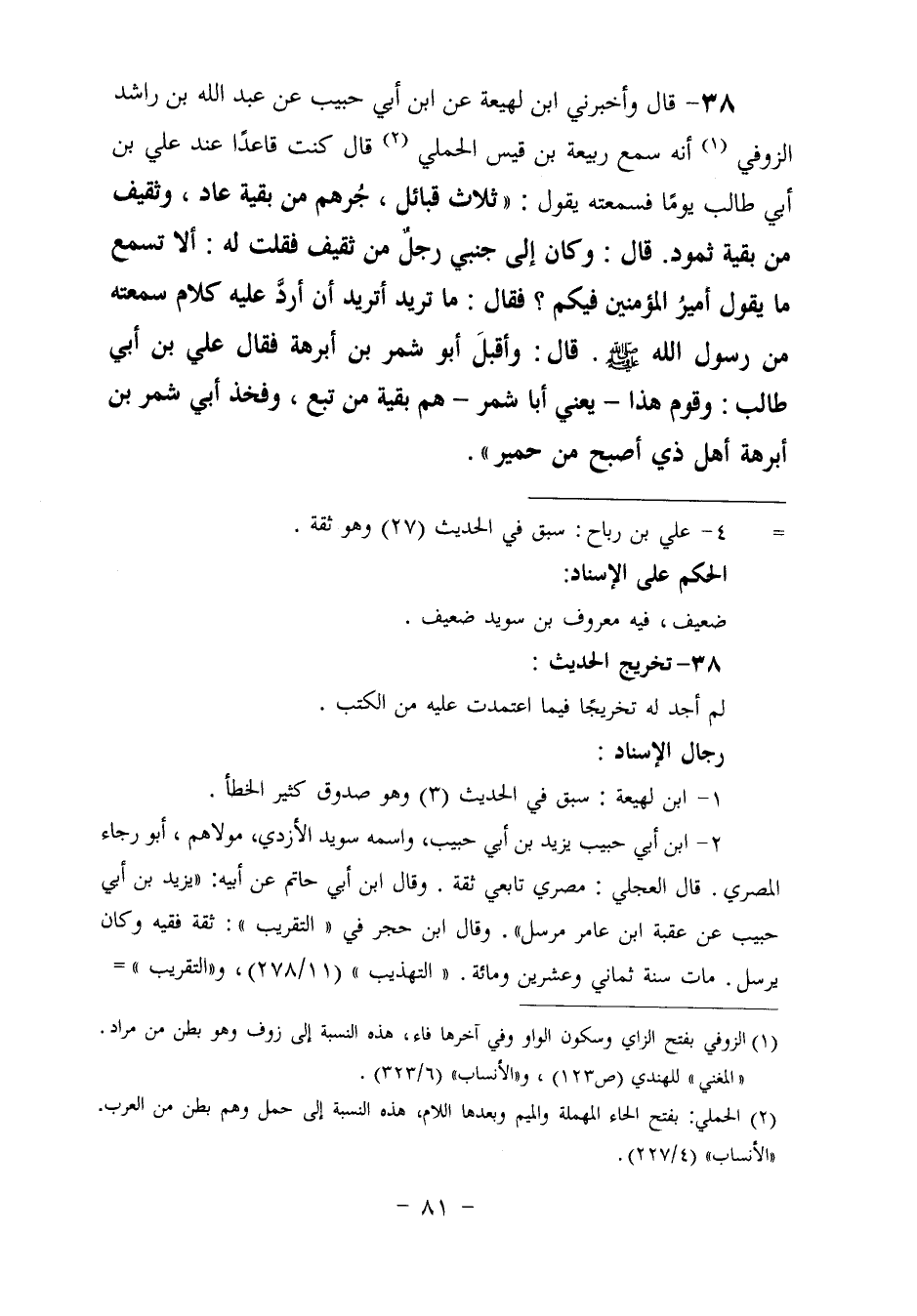 ٣٨ - وَأَخْبَرَنِي ابْنُ لَهِيعَةَ، عَنِ ابْنِ أَبِي حَبِيبٍ، عَنْ عَبْدِ اللَّهِ بْنِ رَاشِدٍ الزَّوْفِيِّ، أَنَّهُ سَمِعَ رَبِيعَةَ بْنَ قَيْسٍ الْحِمَلِيَّ، قَالَ: " كُنْتُ قَاعِدًا عِنْدَ عَلِيِّ بْنِ أَبِي طَالِبٍ يَوْمًا فَسَمِعْتُهُ يَقُولُ: " ثَلَاثُ قَبَائِلَ، جُرْهُمٌ مِنْ بَقِيَّةَ عَادٍ، وَثَقِيفٌ مِنْ بَقِيَّةِ ثَمُودٍ. قَالَ: وَكَانَ إِلَى جَنْبِي رَجُلٌ مِنْ ثَقِيفٍ، فَقُلْتُ لَهُ: أَلَا تَسْمَعُ مَا يَقُولُ أَمِيرُ الْمُؤْمِنِينَ فِيكُمْ؟ فَقَالَ: مَا تُرِيدُ؟ أَتُرِيدُ أَنْ أَرُدَّ عَلَيْهِ كَلَامٌ سَمِعْتُهُ مِنْ رَسُولِ اللَّهِ صَلَّى اللهُ عَلَيْهِ وَسَلَّمَ. قَالَ: وَأَقْبَلَ أَبُو شِمْرِ بْنُ أَبْرَهَةَ، فَقَالَ عَلِيُّ بْنُ أَبِي طَالِبٍ: وَقَوْمُ هَذَا، يَعْنِي أَبَا شِمْرٍ، هُمْ بَقِيَّةٌ مِنْ تُبَّعٍ، وَفَخْذُ أَبِي شِمْرِ بْنِ أَبْرَهَةَ، أَهْلُ ذِي أَصْبَحَ، مِنْ حِمْيَرَ "