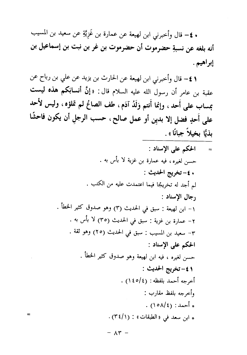 ٤١ - وَأَخْبَرَنِي ابْنُ لَهِيعَةَ، عَنِ الْحَارِثِ بْنِ يَزِيدَ، عَنْ عُلَيِّ بْنِ رَبَاحٍ، عَنْ عُقْبَةَ بْنِ عَامِرٍ، أَنَّ رَسُولَ اللَّهِ عَلَيْهِ السَّلَامُ قَالَ: «إِنَّ أَنْسَابَكُمْ هَذِهِ لَيْسَتْ بِمَسَابٍّ عَلَى أَحَدٍ، وَإِنَّمَا أَنْتُمْ وَلَدُ آدَمَ، طَفُّ الصَّاعِ لَمْ تَمْلَؤُهُ، وَلَيْسَ لِأَحَدٍ عَلَى أَحَدٍ فَضْلٌ إِلَّا بِدِينٍ، أَوْ عَمِلٍ صَالِحٍ، حَسْبُ الرَّجُلِ أَنْ يَكُونَ فَاحِشًا بَذِيًّا بَخِيلًا جَبَانًا» .