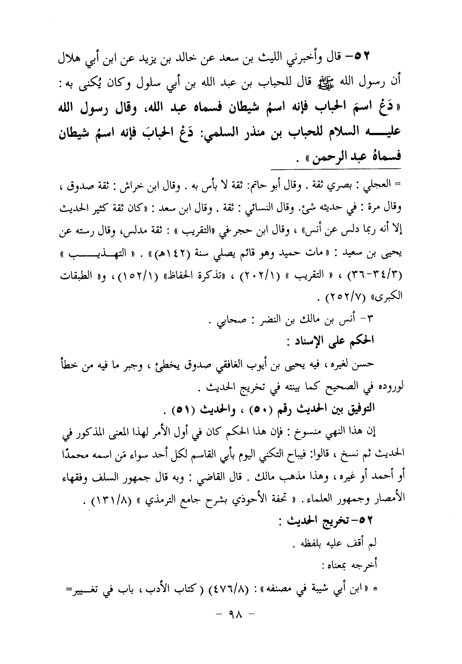 ٥٢ - وَأَخْبَرَنِي اللَّيْثُ بْنُ سَعْدٍ، عَنْ خَالِدِ بْنِ يَزِيدَ، عَنِ ابْنِ أَبِي هِلَالٍ، أَنَّ رَسُولَ اللَّهِ صَلَّى اللهُ عَلَيْهِ وَسَلَّمَ قَالَ لِلْحُبَابِ بْنِ عبد اللَّهِ بْنِ أُبَيٍّ ابْنِ سَلُولَ، وَكَانَ يُكْنَى بِهِ: «دَعِ اسْمَ الْحُبَابِ، فَإِنَّهُ اسْمُ شَيْطَانٍ» . فَسَمَّاهُ عَبْدَ اللَّهِ، وَقَالَ رَسُولُ اللَّهِ عَلَيْهِ السَّلَامُ لِلْحُبَابِ بْنِ مُنْذِرٍ السُّلَمِيِّ: «دَعِ الْحُبَابَ فَإِنَّهُ اسْمُ شَيْطَانٍ» فَسَمَّاهُ عَبْدَ الرَّحْمَنِ "