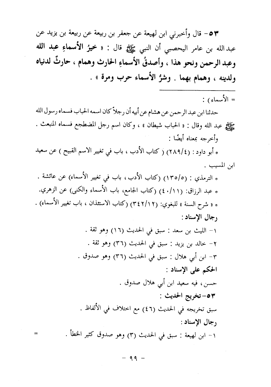 ٥٣ - وَأَخْبَرَنِي ابْنُ لَهِيعَةَ، عَنْ جَعْفَرِ بْنِ رَبِيعَةَ، عَنْ رَبِيعَةَ بْنِ يَزِيدَ، عَنْ عَبْدِ اللَّهِ بْنِ عَامِرٍ الْيَحْصِبِيِّ، أَنَّ النَّبِيَّ صَلَّى اللهُ عَلَيْهِ وَسَلَّمَ قَالَ: «خَيْرُ الْأَسْمَاءِ عَبْدُ اللَّهِ، وَعَبْدُ الرَّحْمَنِ، وَنَحْوَ هَذَا، وَأَصْدَقُ الْأَسْمَاءِ الْحَارِثُ، وَهَمَّامٌ، حَارِثٌ لِدُنْيَاهُ وَلِدِينِهِ، وَهَمَّامٌ بِهِمَا. وَشَرٌّ الْأَسْمَاءِ حَرْبٌ، وَمُرَّةُ»