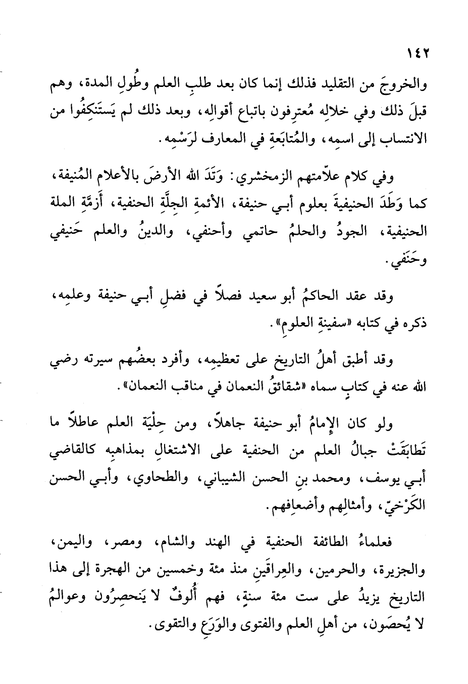 ولو كان الإمام أبو حنيفة جاهلاً ومن حلية العلم عاطلاً ما تطابقت جبال العلم من الحنفية على الاشتغال بمذاهبه, كالقاضي أبي يوسف, ومحمد بن الحسن الشيباني, والطّحاوي, وأبي الحسن الكرخي, وأمثالهم وأضعافهم.