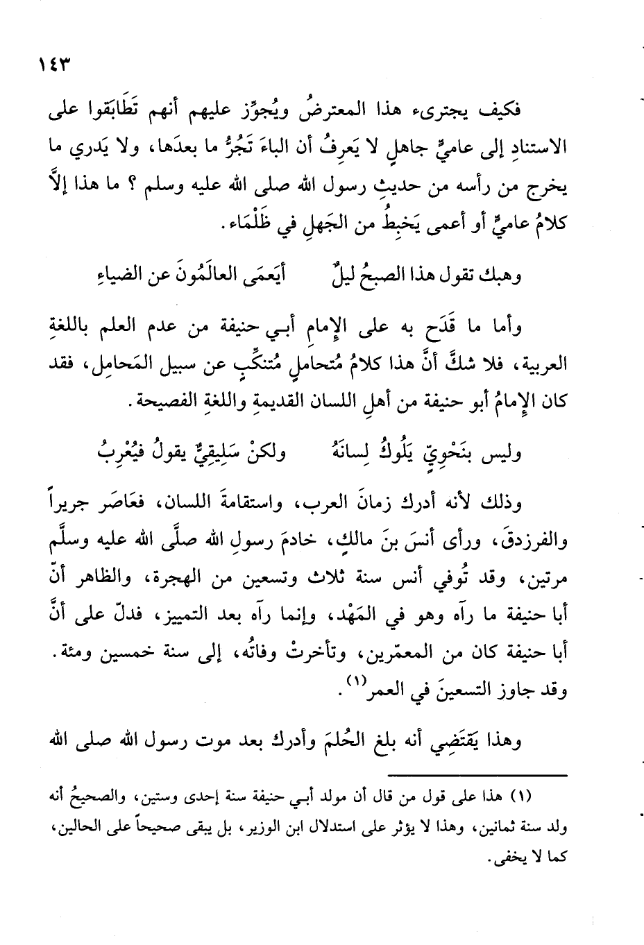 وأمّا ما قدح به على الإمام أبي حنيفة من عدم العلم باللغة العربية فلا شك أن هذا كلام متحامل, متنكب عن سبيل المحامل, فقد كان الإمام أبو حنيفة من أهل اللسان القويمة واللغة الفصيحة.